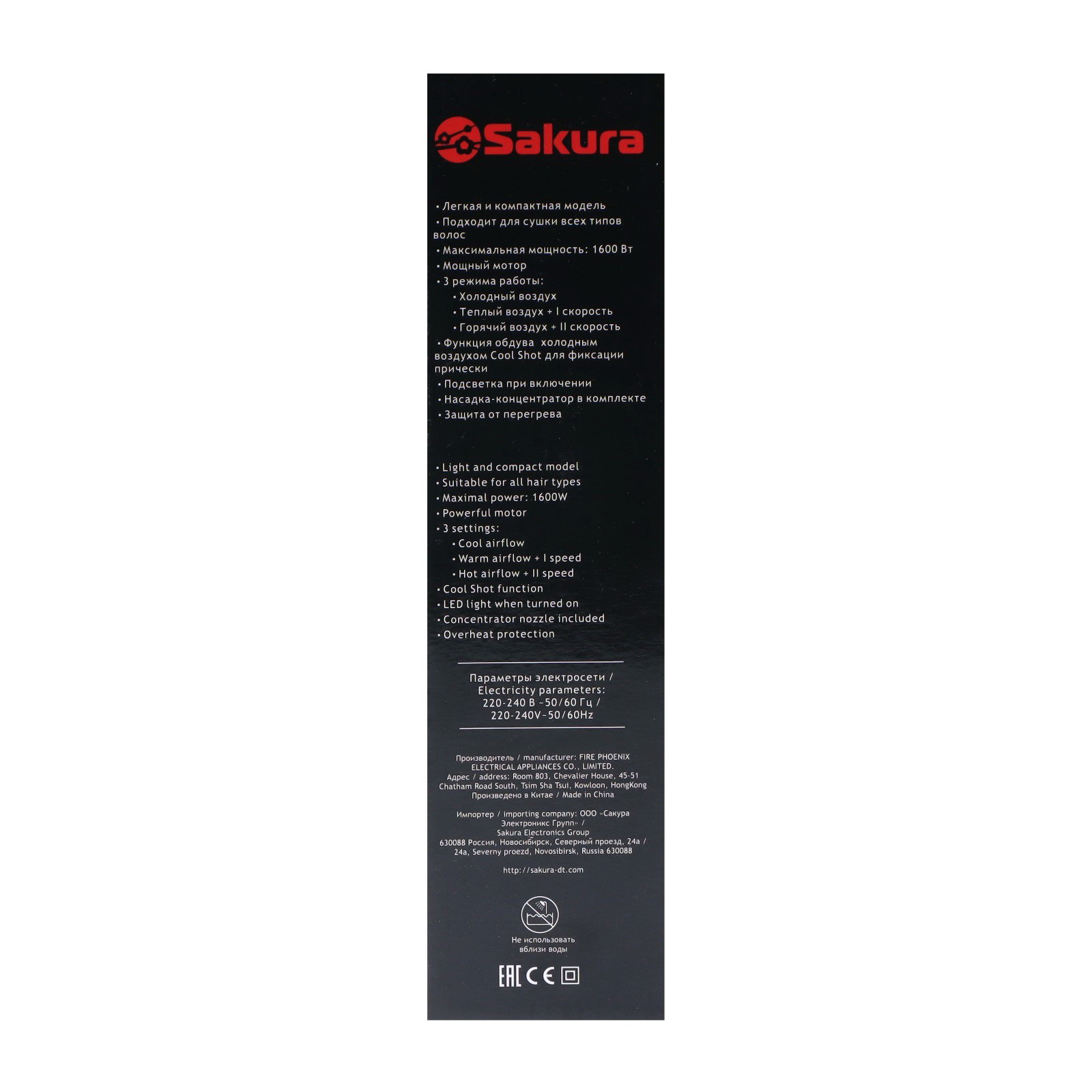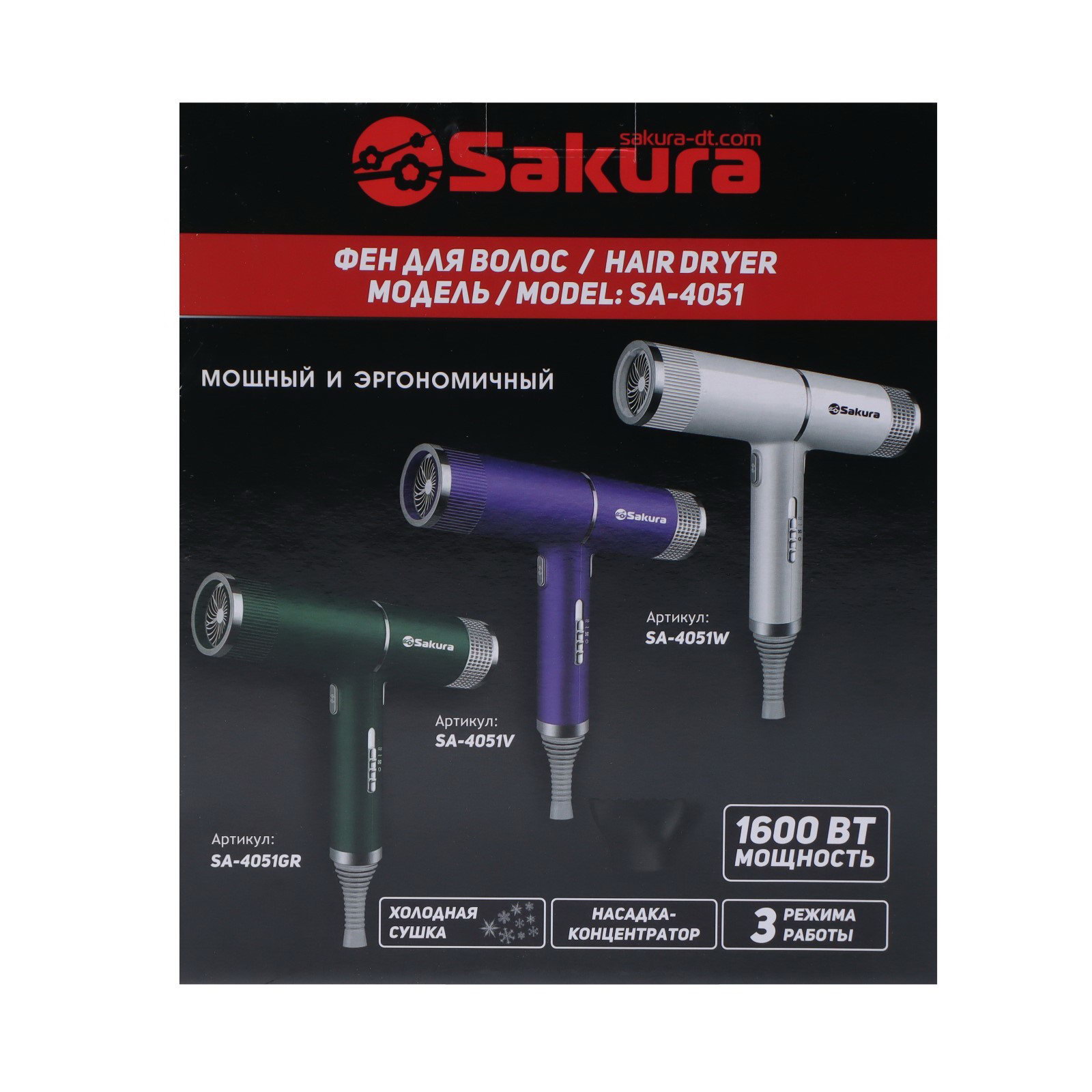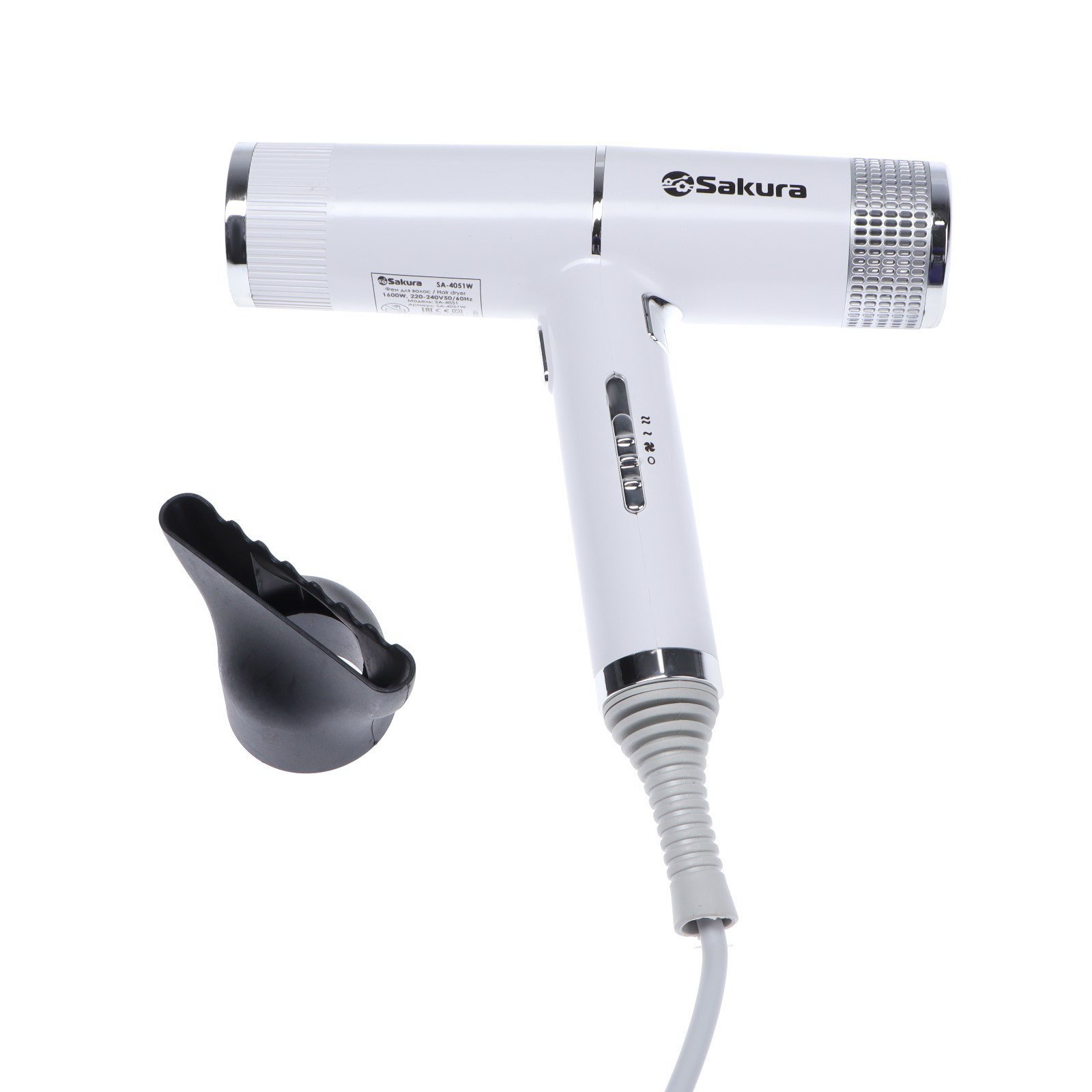 Фен SA-4051W, 1600 Вт, 3 скорости, 3 температурных режима, концентратор, шнур 1.8 м, белый, SAKURA, Китай
