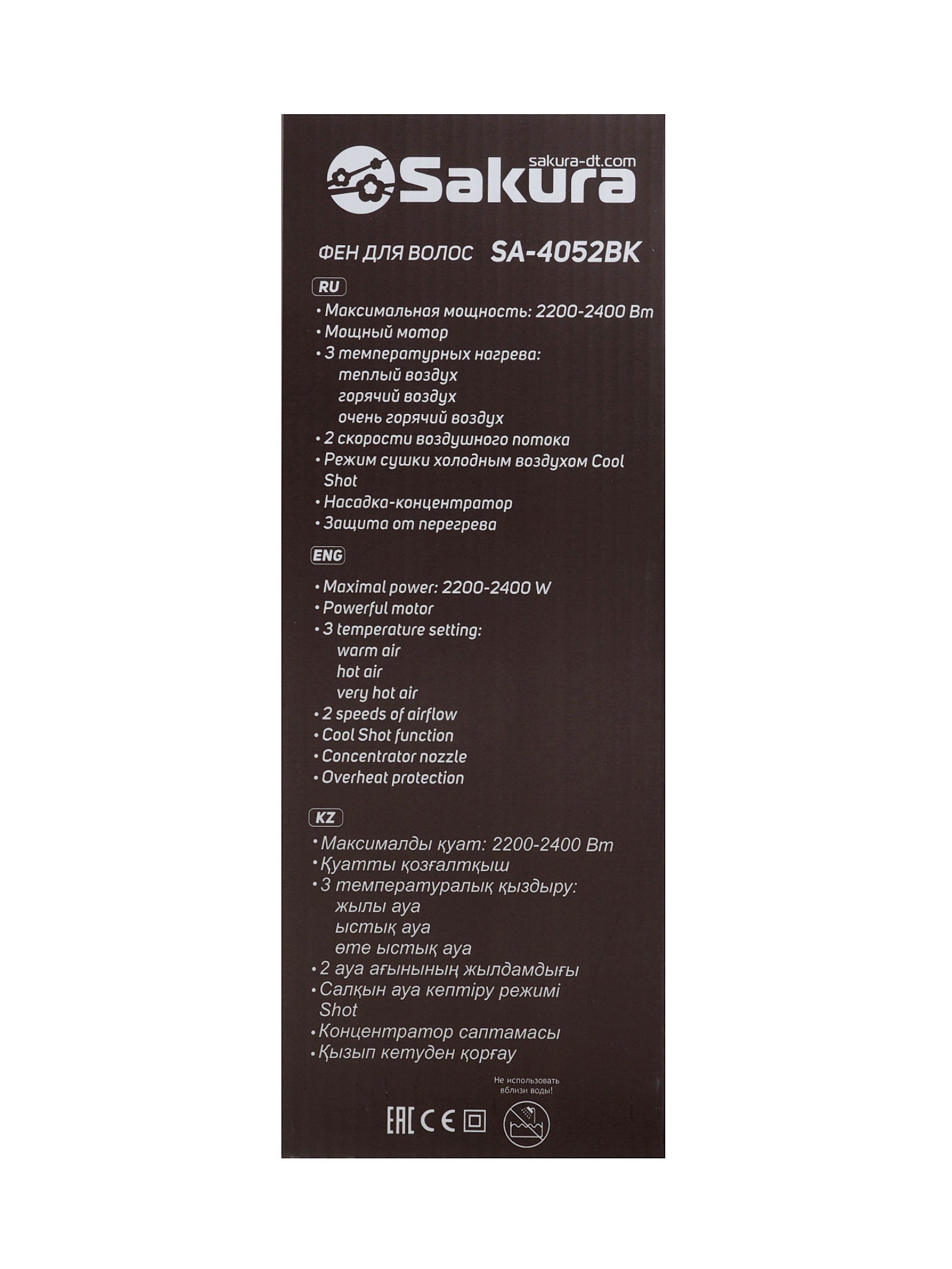 Фен SA-4052BK, 2400 Вт, 1.8 м, 3 температурных режима, 2 скорости, сушка холодным воздухом, SAKURA, Китай