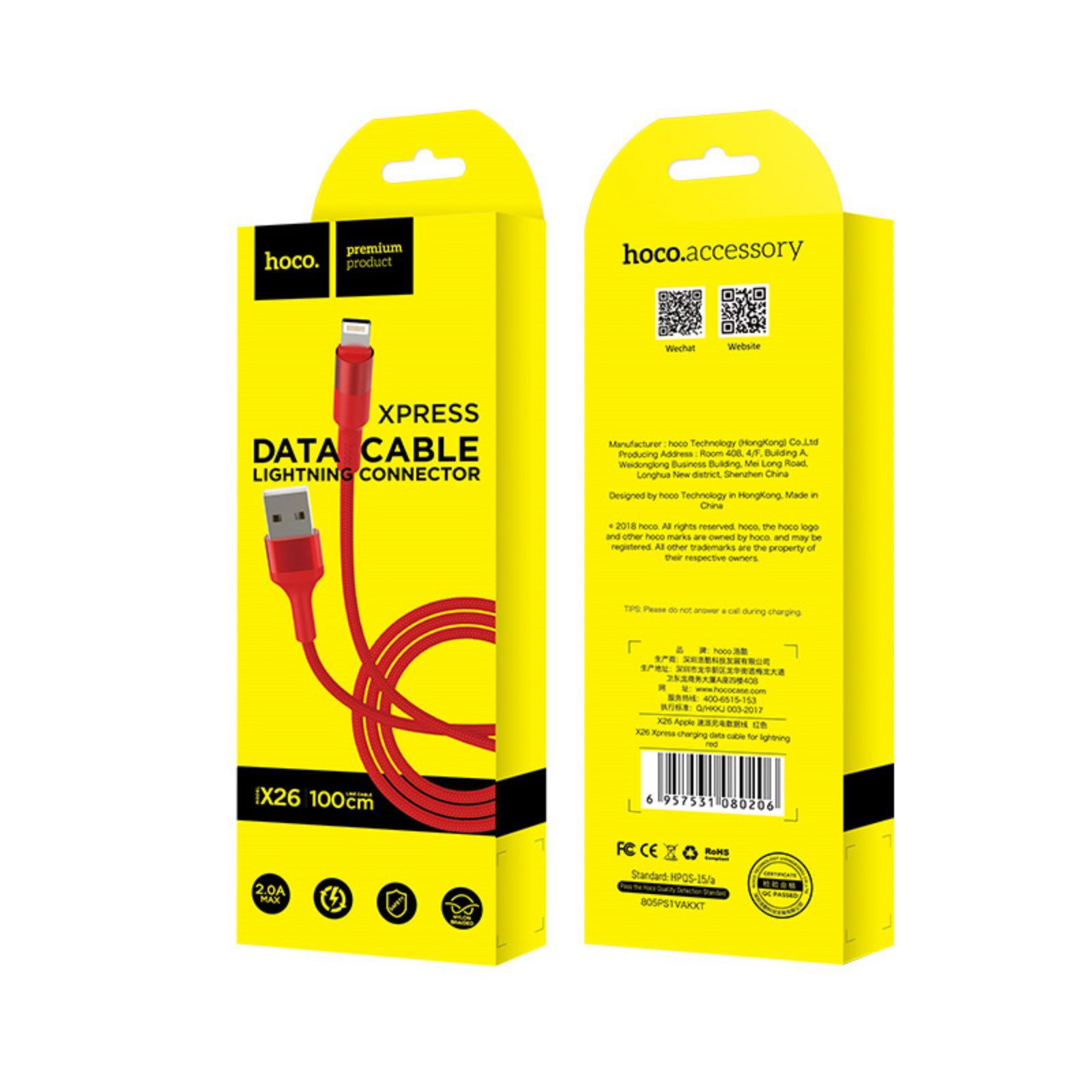 Кабель X26, Lightning - USB, 2 А, 1 м, передача данных, оплётка нейлон, красный, 8x1.5x4 см., Hoco, Китай