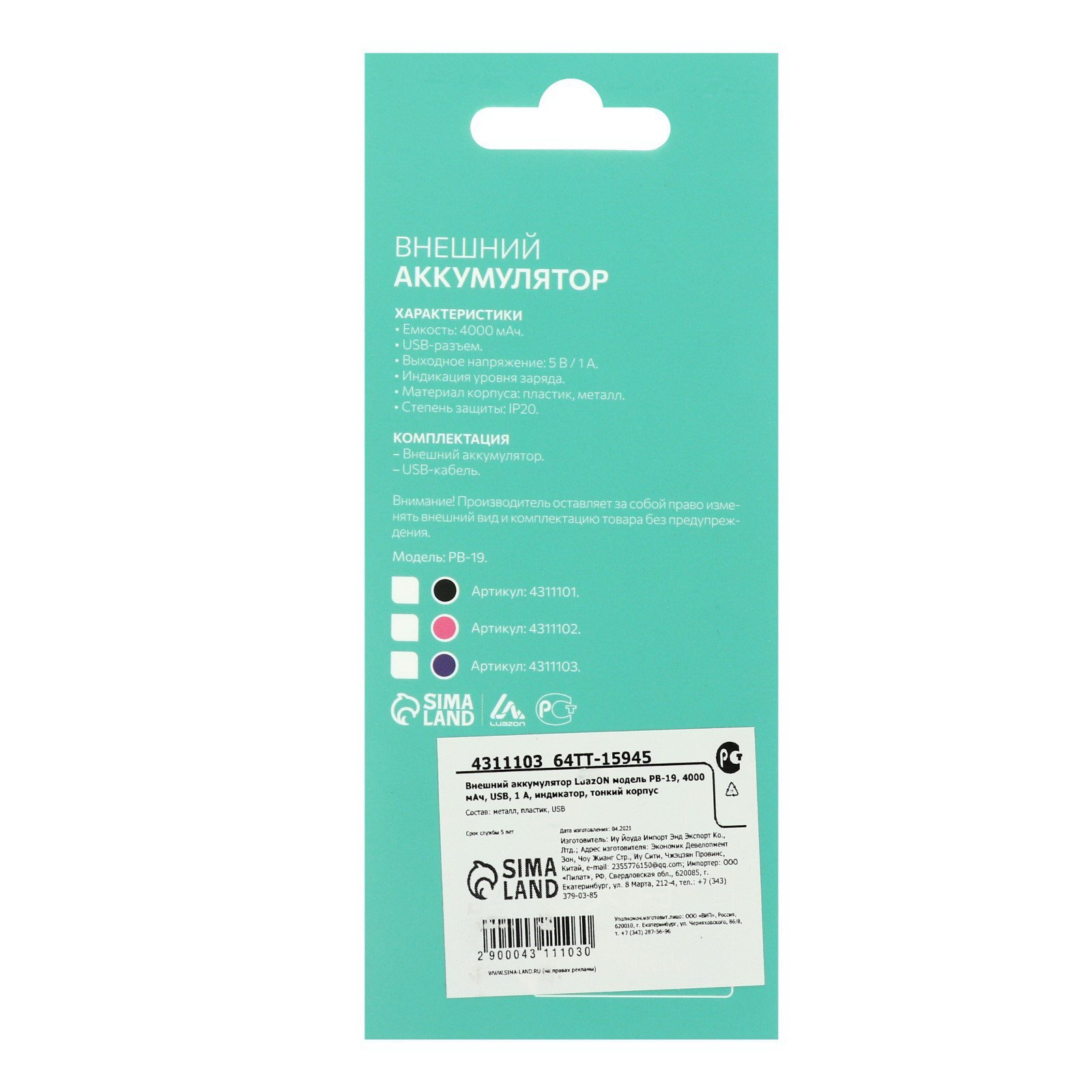 Внешний аккумулятор Luazon PB-19, 4000 мАч, USB, 1 А, индикатор, металл, синий, 8x12x2 см., Luazon Home, Китай