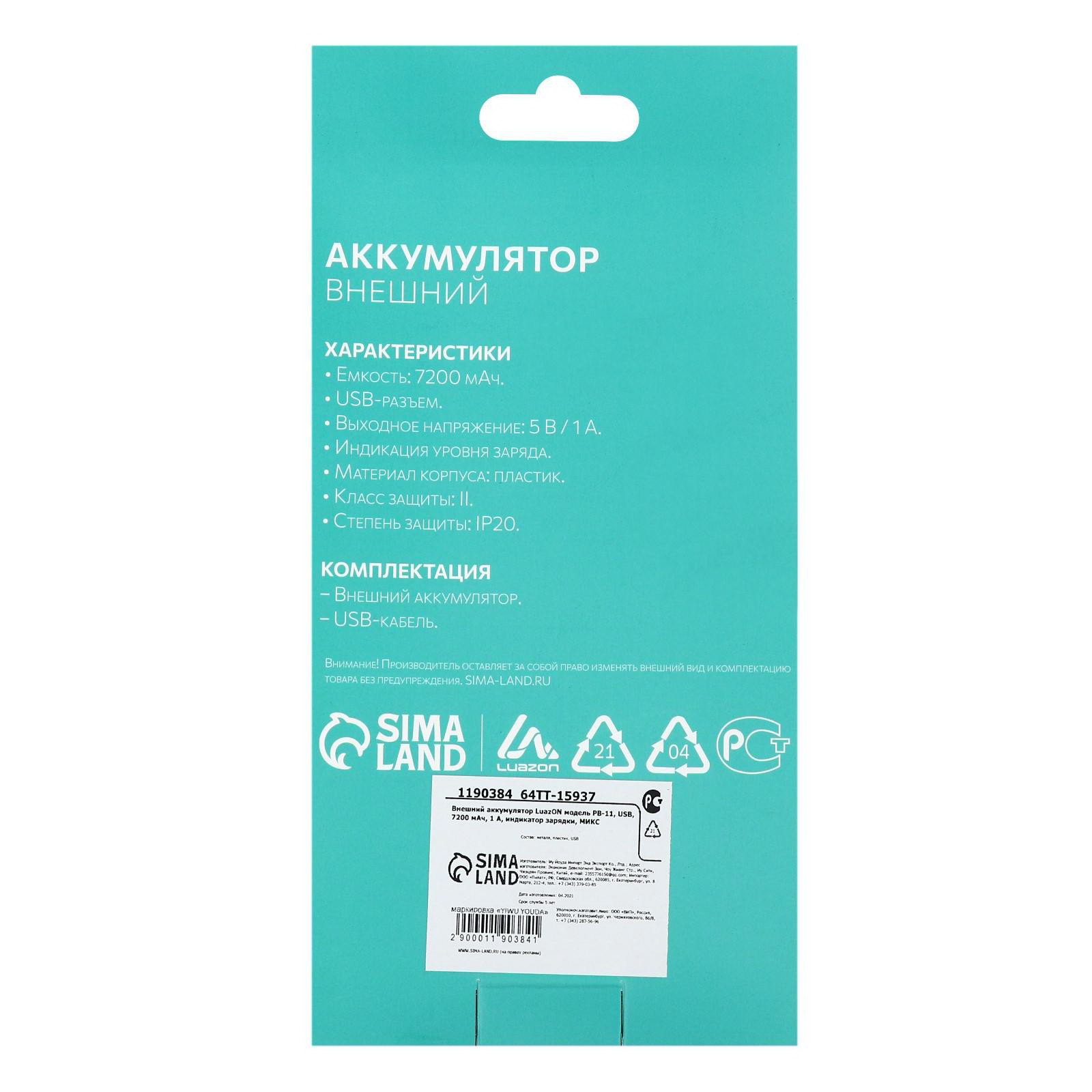 Внешний аккумулятор Luazon PB-11, USB, 7200 мАч, 1 A, индикатор зарядки, МИКС, 7.5x9x2.3 см., Luazon Home, Китай