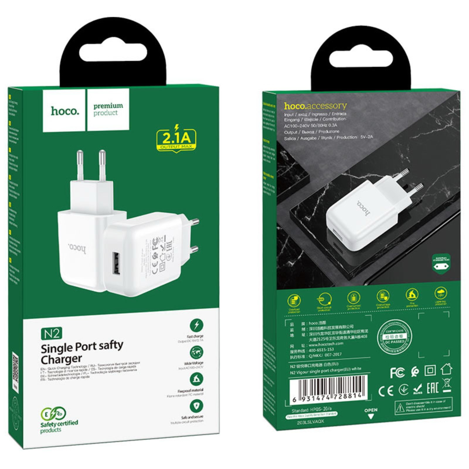 Сетевое зарядное устройство N2, 1 USB, 2 А, белое, 5x4x8 см., Hoco, Китай