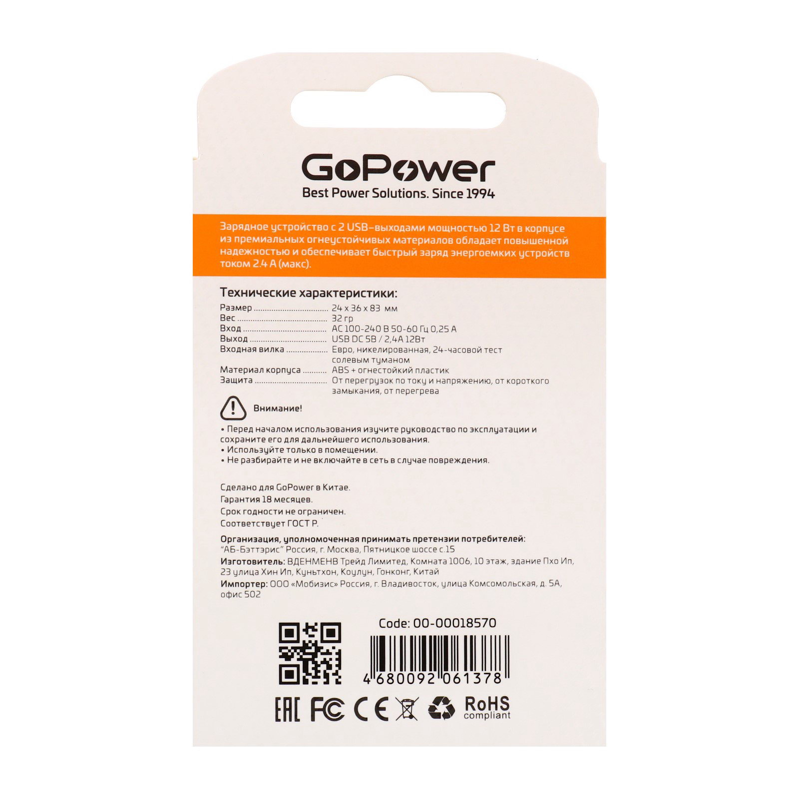 Сетевое зарядное устройство GP2U, 2 USB, 2.4 А, белое, GoPower, Китай
