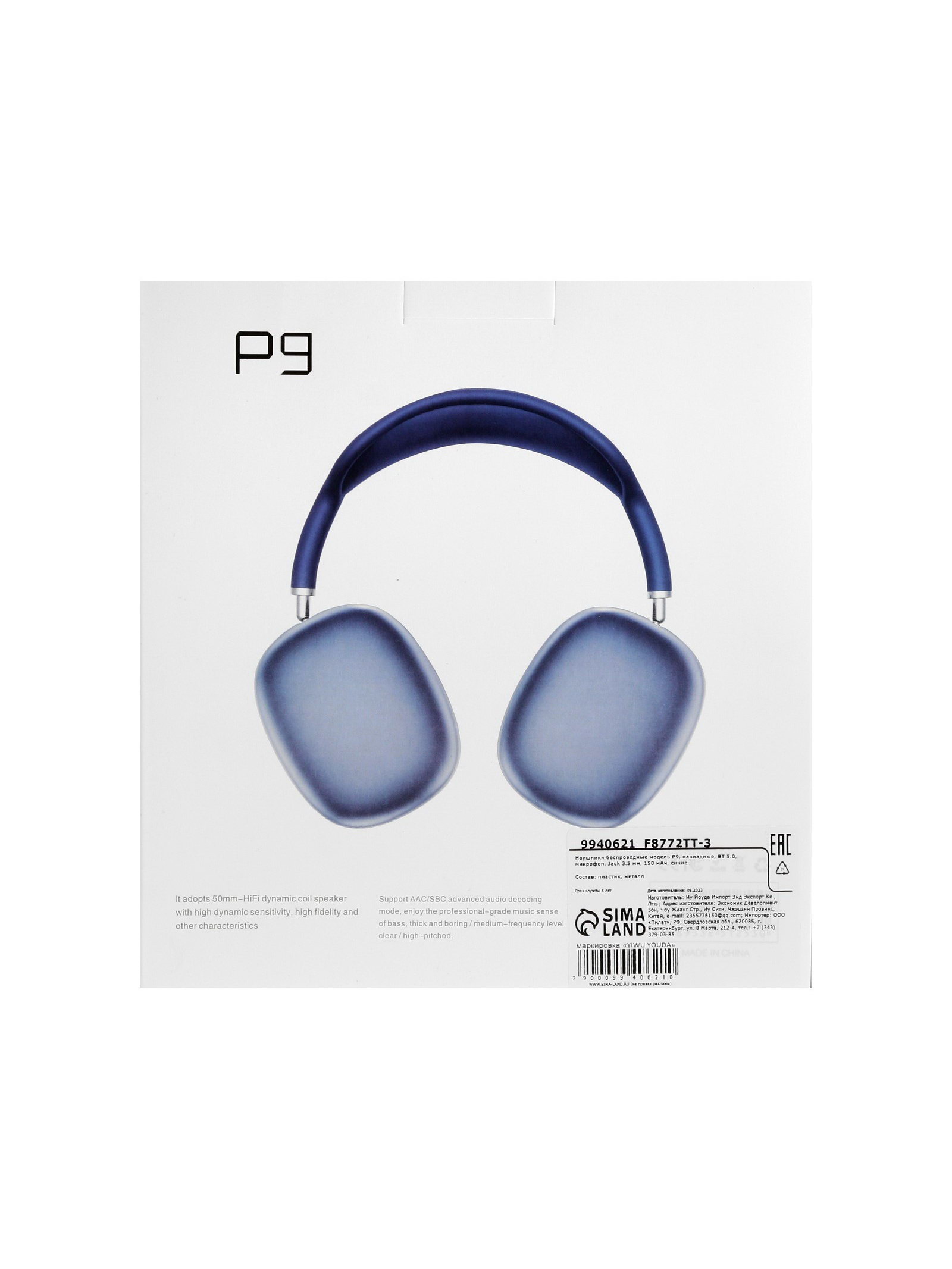 Наушники беспроводные, полноразмерные, P9, Bluetooth 5.0, с микрофоном, Jack 3.5 мм 150 мАч, синие, 19x22x4 см., Китай