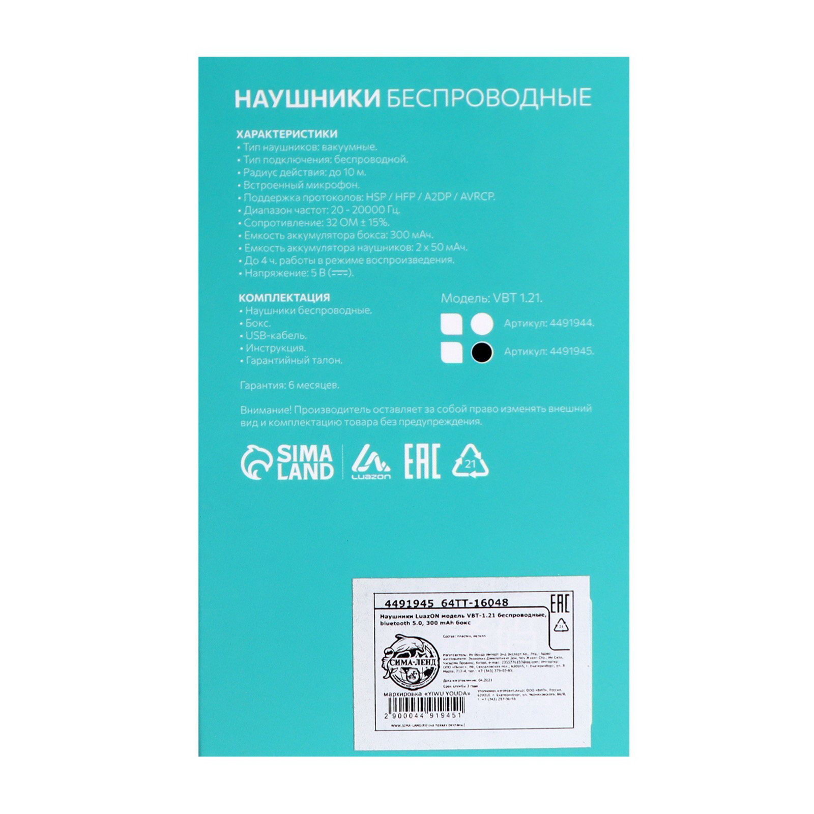 Наушники беспроводные LuazON VBT 1.21, вакуумные, Bluetooth 5.0, 300 мАч бокс, черные, 8x13x4.5 см., Luazon Home, Китай