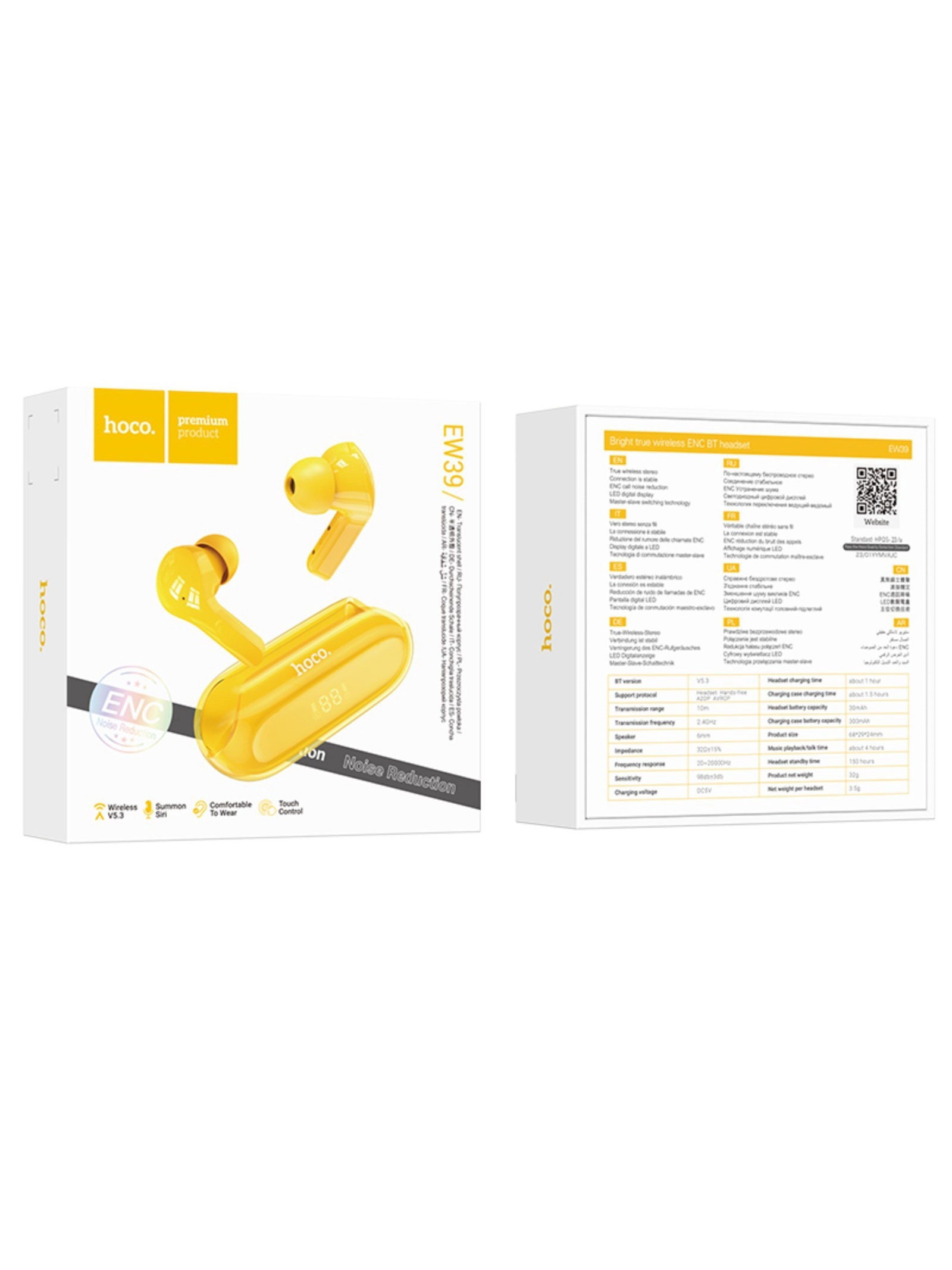Наушники беспроводные EW39, TWS, вакуумные, Bluetooth 5.3, 30/300 мАч, шумоподавление, жёлтые, 1x2x1 см., Hoco, Китай