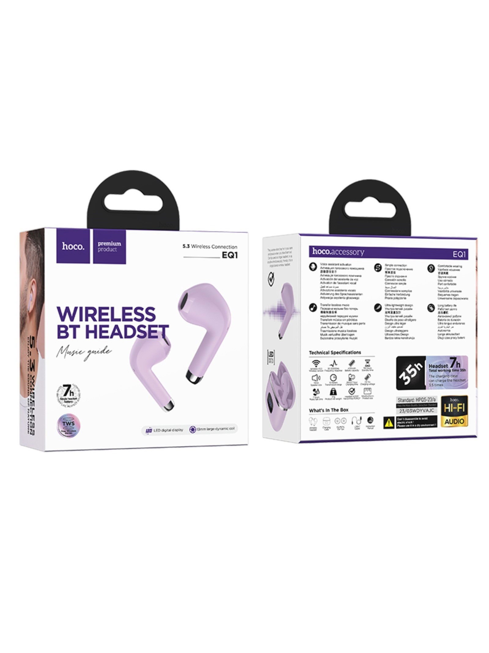 Наушники беспроводные EQ1, TWS, вкладыши, Bluetooth 5.3, 40/400 мАч, с дисплеем, фиолетовые, 1x2x1 см., Hoco, Китай
