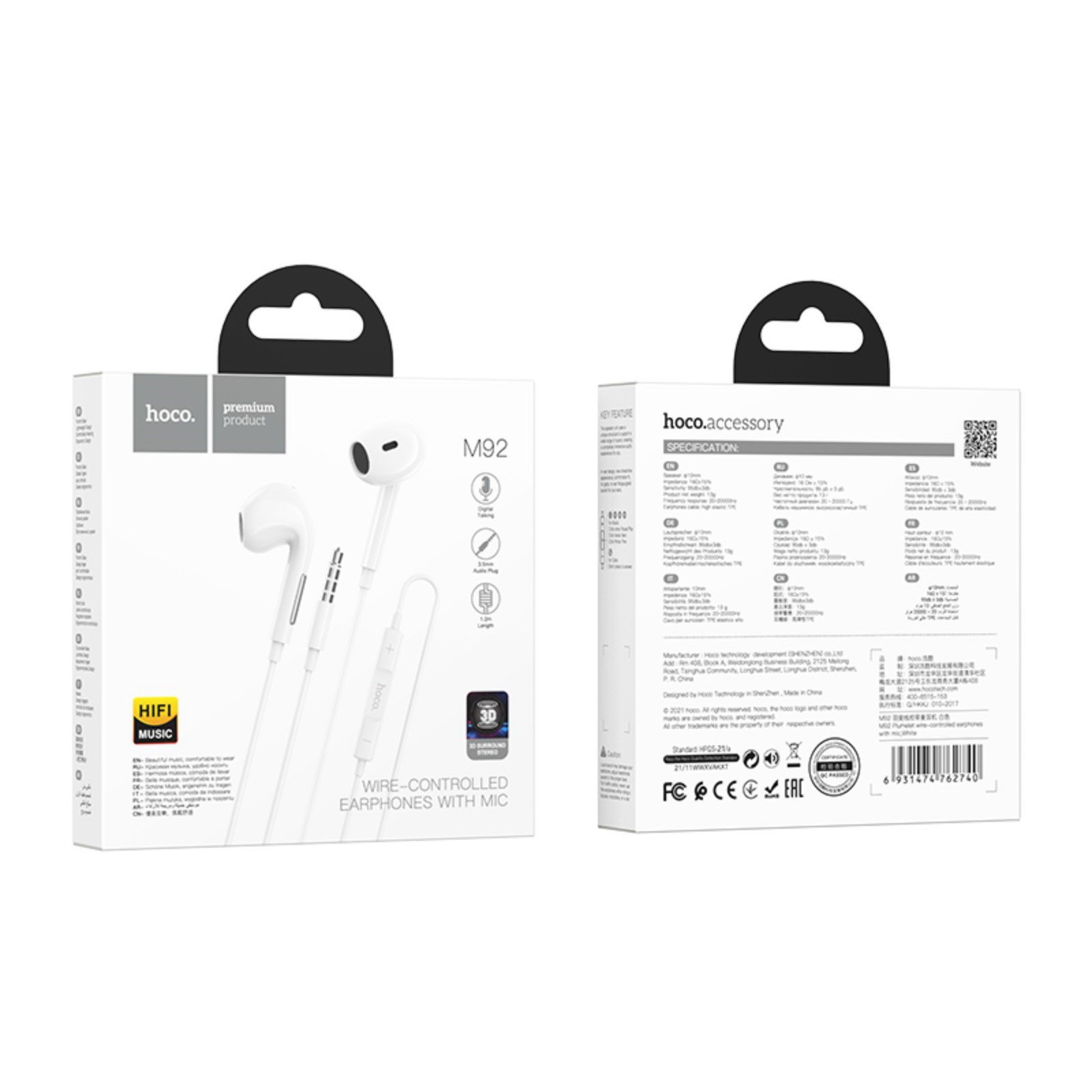 Наушники M92, проводные, вкладыши, микрофон, кабель 1.2 м, белые, 1x2x1 см., Hoco, Китай