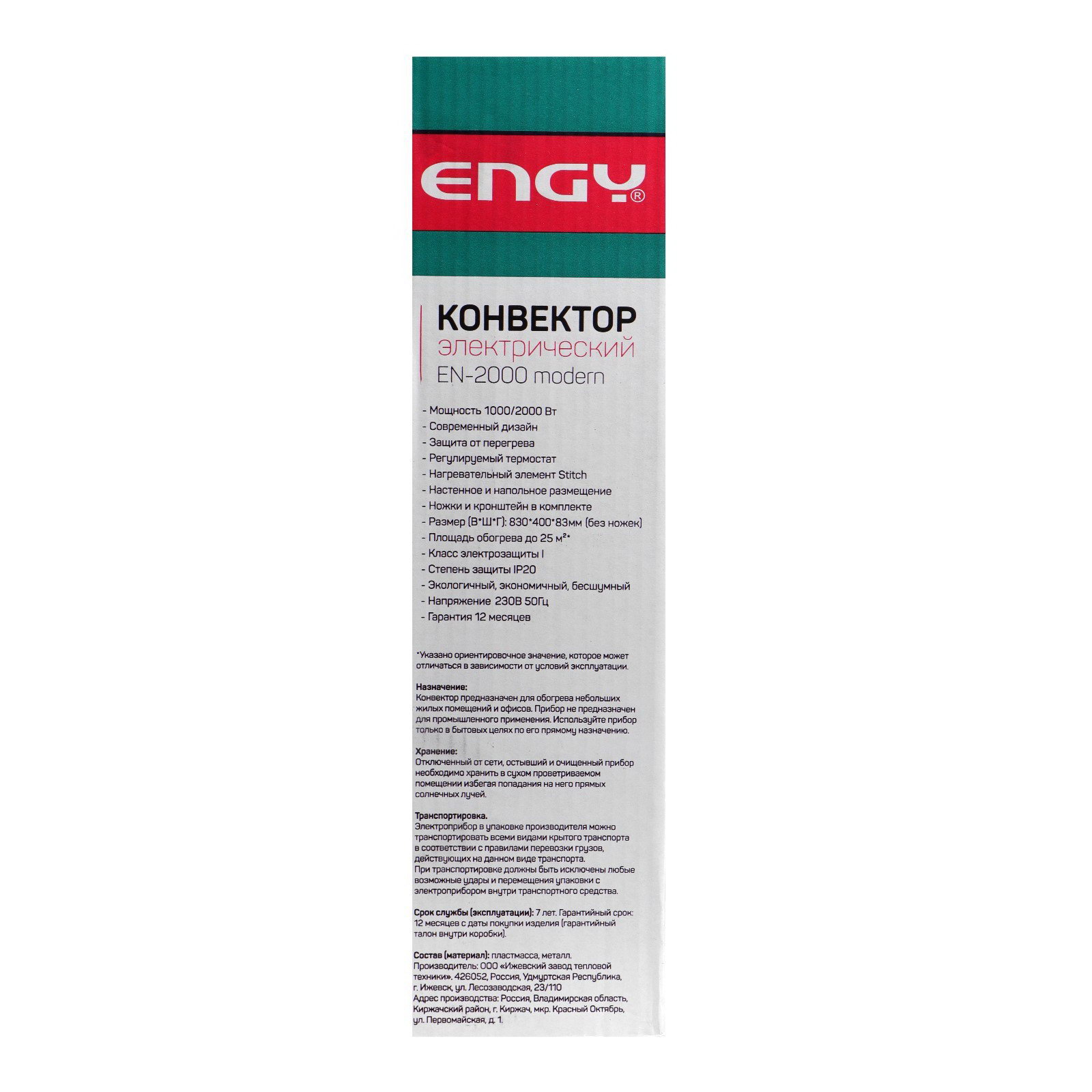 Мощность, Вт: 1000, 2000 Размер упаковки: 45 x 12.4 x 85 см. tnved: 8516295000 Гарантийный срок, мес.: 12 Температурное ограничение: Нет Регулировка мощности: Да Площадь обогрева, ?2: 25 Индикация включения: Нет Цвет: Белый Вид установки: Напольный Тип управления: Механическое Термостат: Механический Тип нагревательного элемента: Игольчатый С пультом ДУ: Нет Защита от перегрева: Да Таймер: Нет Регулировка температуры: Нет Дисплей: Нет Управление со смартфона: Нет Отключение при опрокидывании: Да Количество режимов нагрева: 1 Электрический конвектор ENGY EN-2000 предназначен для обогрева жилых помещений площадью до 25 ?2. Выбирайте необходимую мощность нагрева с помощью регулируемого термостата. Нагревательный элемент ''Stitch'' обечпечивает мгновенный нагрев и быстрое достижение заданной температуры. Будьте уверены в безопасности с функцией защиты от перегрева устройства. Наличие кронштейна позволяет закрепить изделие на стене или поставить на ножки. Благодаря современный дизайну устройство дополнит интерьер помещения. | ||