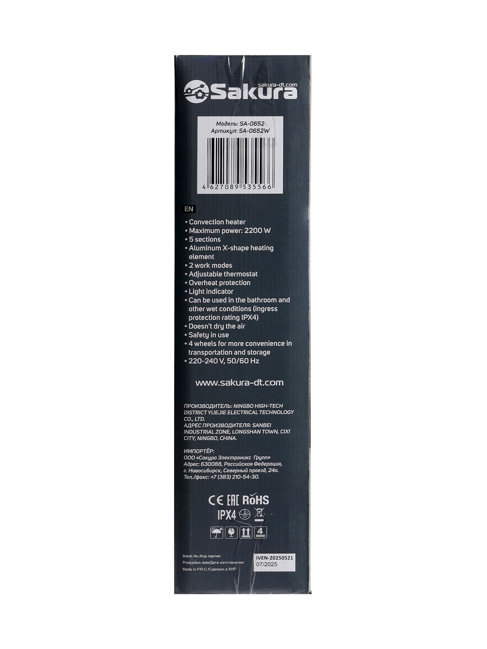 Конвектор электрический SA-0652W, 2200 Вт, до 22 ?2, напольный/настенный, IPХ4, 2 режима, SAKURA, Китай