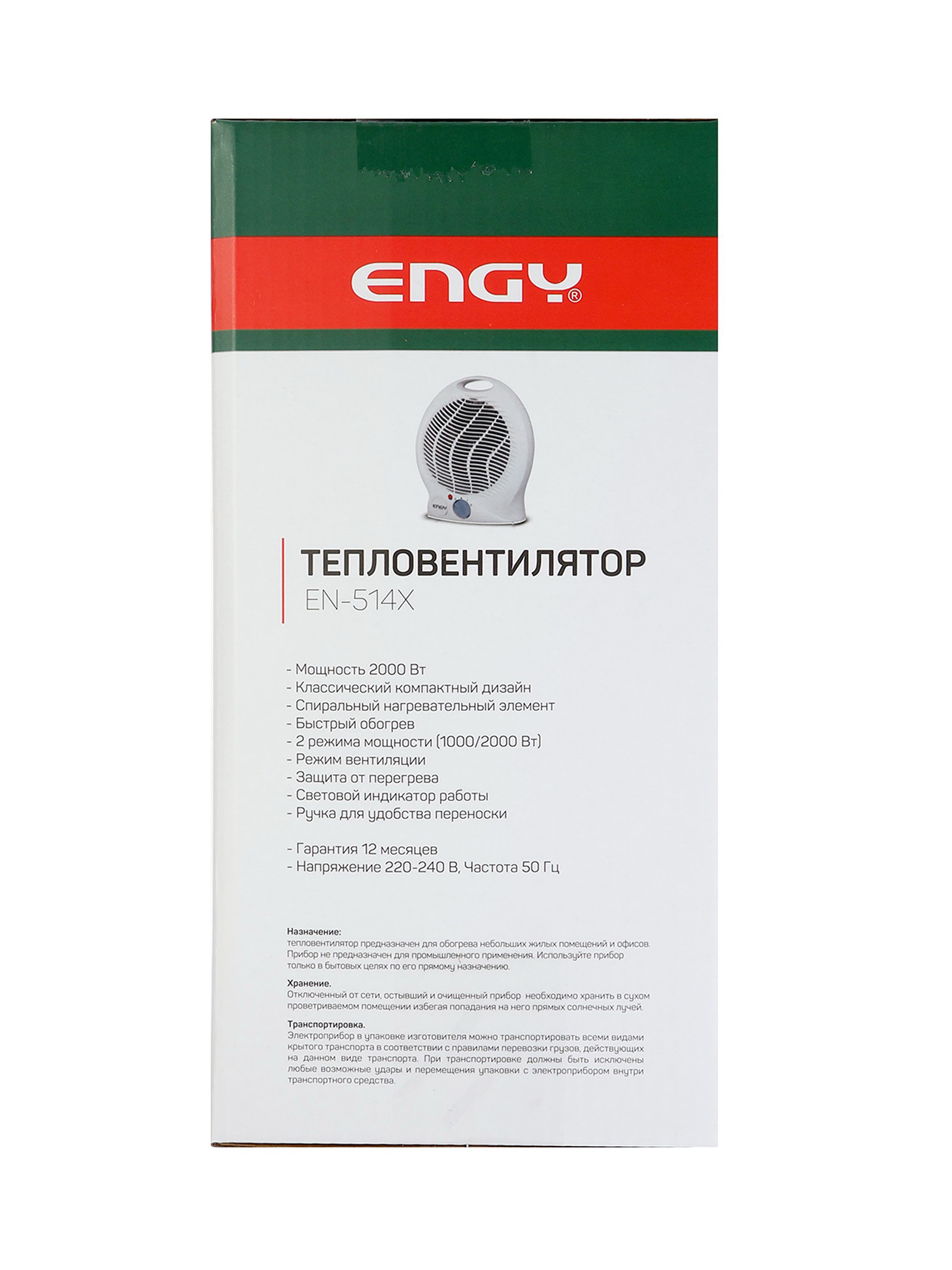 Размер упаковки: 13.5 x 27 x 22.5 см. Таймер: Нет Тип питания: От сети 220 В Тип управления: Поворотные переключатели Управление со смартфона: Нет Дисплей: Нет Термостат: Нет Функция антизамерзания: Нет Регулировка температуры: Нет tnved: 8516295000 Гарантийный срок, мес.: 12 Температурное ограничение: Нет С пультом ДУ: Нет Цвет: Белый Вид установки: Напольный Тип нагревательного элемента: Спиральный Площадь обогрева, ?2: 25 Регулировка мощности: Да Защита от перегрева: Да Мощность, Вт: 2000 Вентиляция без нагрева: Да С датчиком опрокидывания: Нет Количество режимов: 2 Компактный тепловентилятор ENGY EN-514X обеспечит вам комфортное тепло в любой комнате. С мощностью 2000 Вт и двумя режимами работы, он идеально подойдет для обогрева помещений площадью до 25 ?2. Белый цвет и компактные размеры устройства позволяют легко интегрировать его в любой интерьер, не занимая много места на полу. Управление прибором осуществляется с помощью поворотных переключателей, что делает его использование простым и интуитивно понятным. Включение вентиляции без нагрева позволяет использовать его не только зимой, но и в межсезонье, когда нужно обеспечить циркуляцию воздуха, но не требуется обогрев. Защита от перегрева гарантирует безопасность в процессе эксплуатации, предотвращая перегрев устройства. Тепловентилятор не требует дополнительных сложных настроек или управления с пульта, что делает его идеальным выбором для тех, кто ценит простоту и надежность. Без лишних функций, таких как таймер или термостат, он фокусируется на главной задаче качественном обогреве помещения.