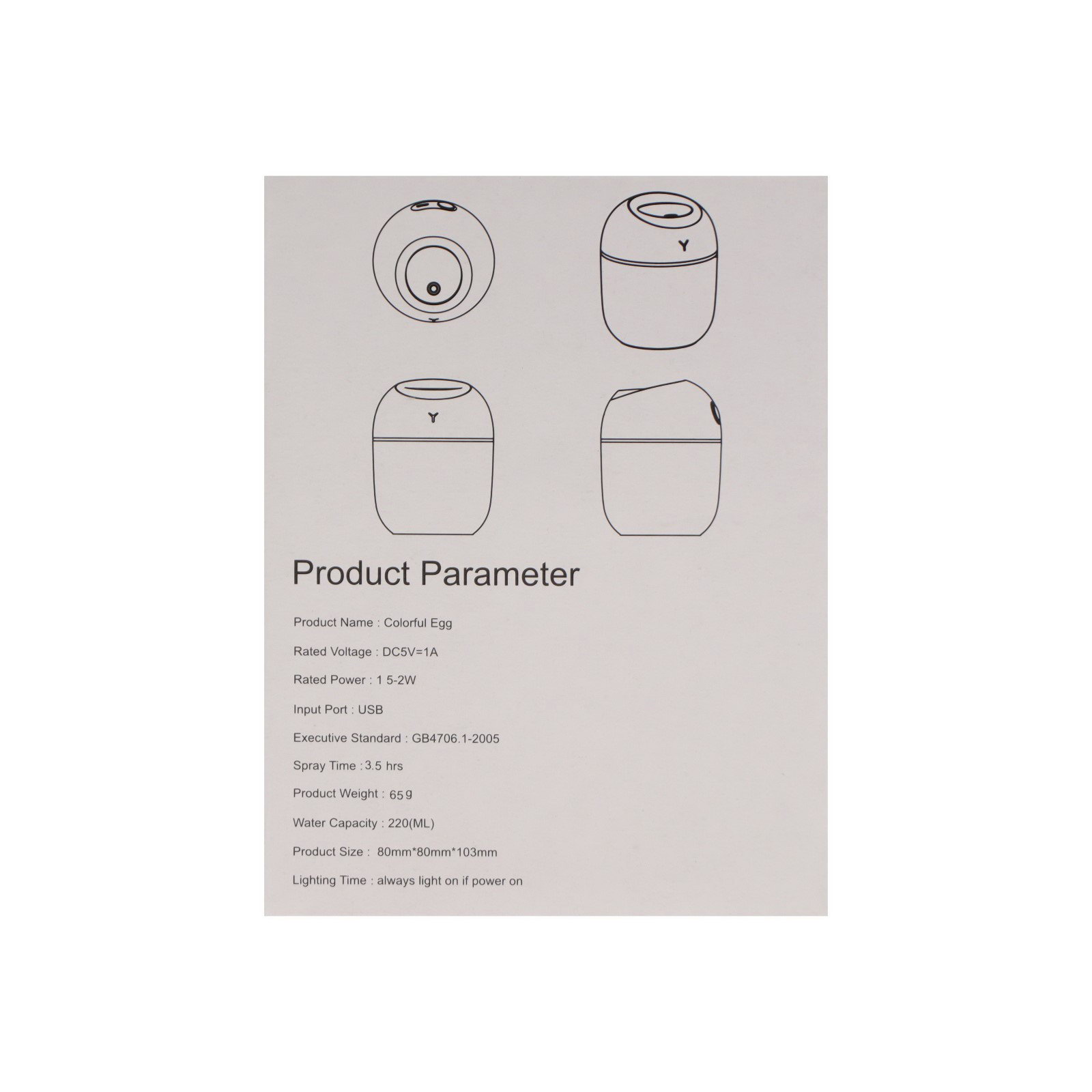 Размер упаковки: 8 x 10.5 x 8 см. С фильтром: Нет С фильтром: Нет tnved: 8509800000 Гарантийный срок, мес.: 6 С пультом ДУ: Нет Таймер: Нет Мощность, Вт: 1.5 Блокировка включения без воды: Нет Индикация включения: Нет Дисплей: Нет Ионизация: Нет Тип увлажнителя: Ультразвуковой Тип управления: Кнопки Особенности: С подсветкой Индикация температуры: Нет Гигростат: Нет Цвет: Белый УФ-лампа: Нет Тип установки: Портативный Ароматизация: Нет Тип питания: От USB Регулировка интенсивности испарения: Нет Автовыключение без воды: Нет Объём резервуара для воды, л: 0.22 Индикатор низкого уровня воды: Нет Управление со смартфона: Нет Индикатор загрязнения фильтра: Нет Долив воды: Нет | ||