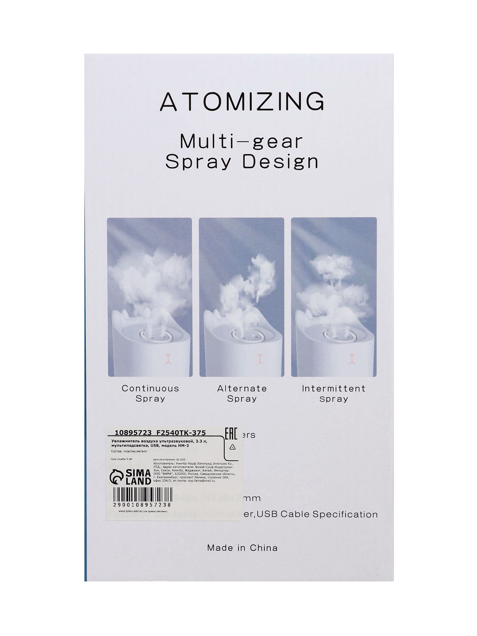 Увлажнитель воздуха HM-3, ультразвуковой, 3.3 л, мультиподсветка, USB, белый, 14.2x24.8x14.2 см., Китай