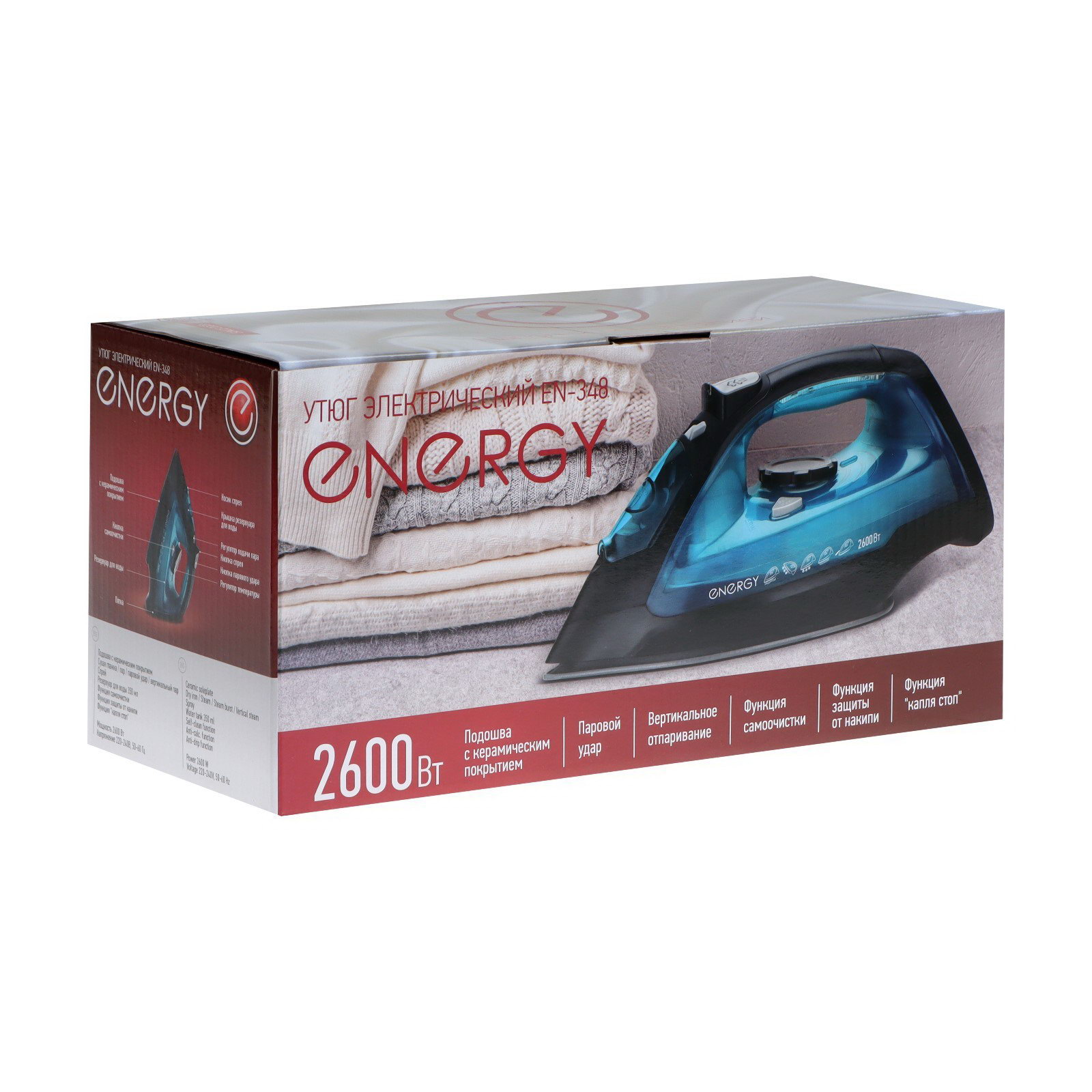 Цвет: Бирюзовый, Чёрный Размер упаковки: 13.5 x 15.5 x 30.5 см. tnved: 8516400000 Гарантийный срок, мес.: 12 Температурное ограничение: Нет Противокапельная система: Да Вертикальное отпаривание: Нет Функция разбрызгивания: Да Длина шнура, м: 1.8 Наличие парогенератора: Да Мощность, Вт: 2600 Функция самоочистки: Да Защита от накипи: Да Подача пара: Да Скорость парового удара, г/мин: 23 Объём резервуара для воды, мл: 0.35 Паровой удар: Да Автоматическое отключение: Да Беспроводной: Нет Вращающийся шнур: Нет Материал подошвы утюга: Металлокерамика Утюг ENERGY EN-348 сочетает в себе функциональность и удобство использования. Керамическая подошва обеспечивает легкое скольжение по любой ткани, гарантируя отличные результаты глажки. Функция самоочистки упрощает уход за устройством, а защита от накипи продлевает срок его службы. Благодаря функции "капля-стоп" вы можете гладить деликатные ткани без риска образования пятен. Этот утюг станет надежным помощником в уходе за одеждой. | ||