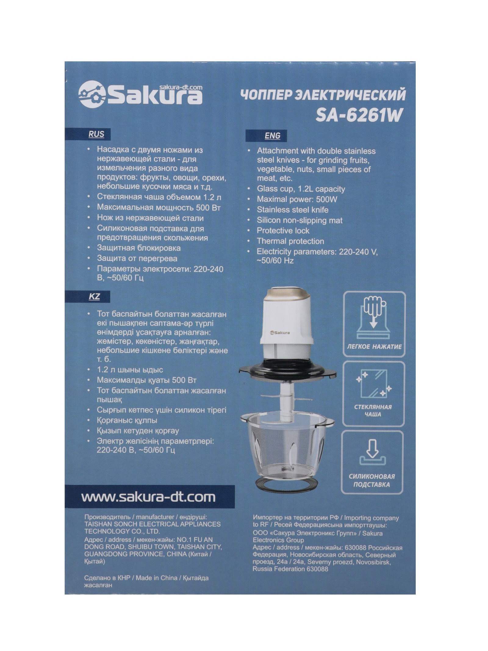 Измельчитель SA-6261W, 1.2 л, 500 Вт, стекло, 4 ножа, белый, SAKURA, Китай