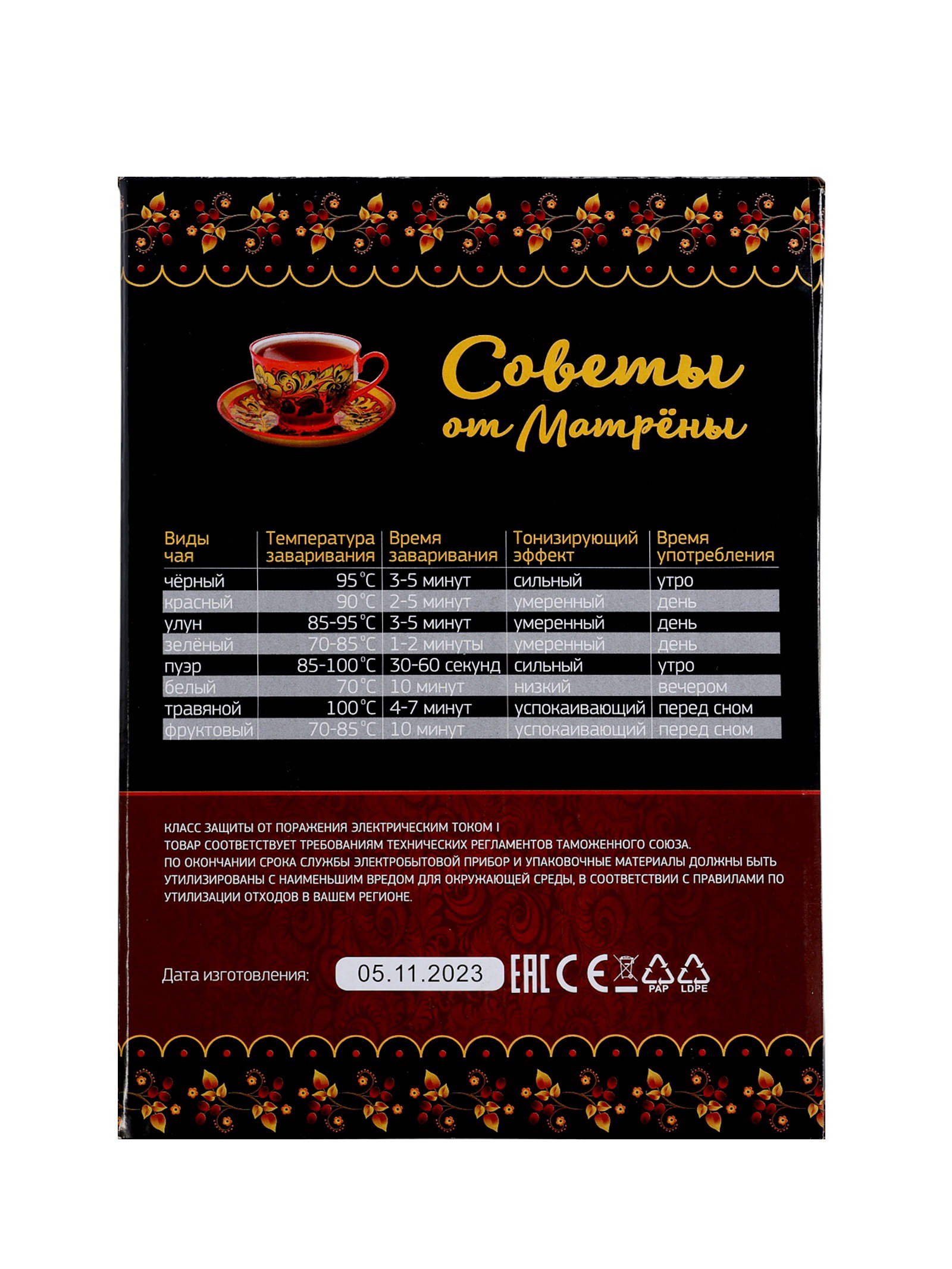 Размер упаковки: 17 x 23 x 20 см. tnved: 8516797000 Гарантийный срок, мес.: 12 Температурное ограничение: Нет Материал корпуса: Металл Индикатор уровня воды: Нет Подсветка: Нет Мощность, Вт: 1500 Двойные стенки: Нет Регулировка температуры: Нет Поддержание температуры: Нет Цвет: Бежевый Тип нагревательного элемента: Закрытый Автоматическое отключение: Да Блокировка крышки: Да Дисплей: Нет Беспроводное использование: Нет Электрический чайник "Матрёна" MA-002 это мощное устройство с потребляемой мощностью 1500 Вт, обеспечивающее быстрое кипячение воды. Чайник оснащён функцией автоматического отключения, которая срабатывает при достижении воды кипения, гарантируя безопасность эксплуатации и предотвращая перегрев. "Матрёна" MA-002 сочетает в себе стильный дизайн, удобство и надежность, делая его отличным выбором для вашего дома или офиса. | ||