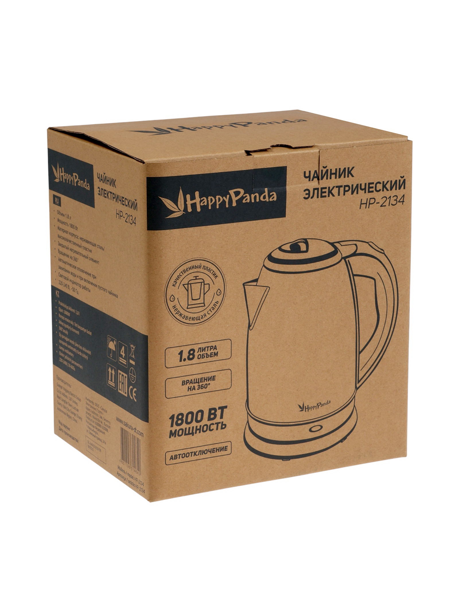 Чайник электрический Happy panda HP-2134, 1.8 л, 1800 Вт, металл, серый, 1800 мл., SAKURA, Китай