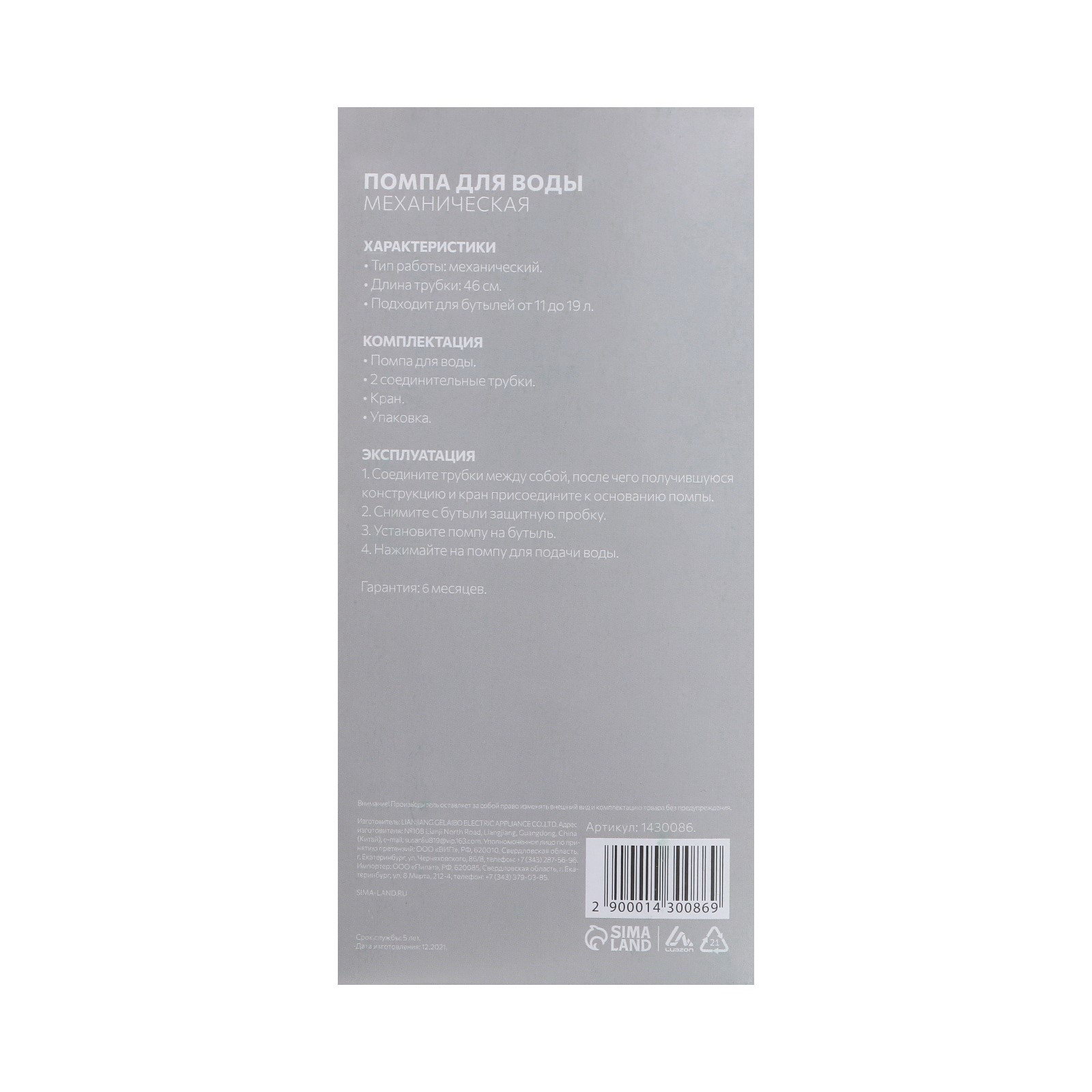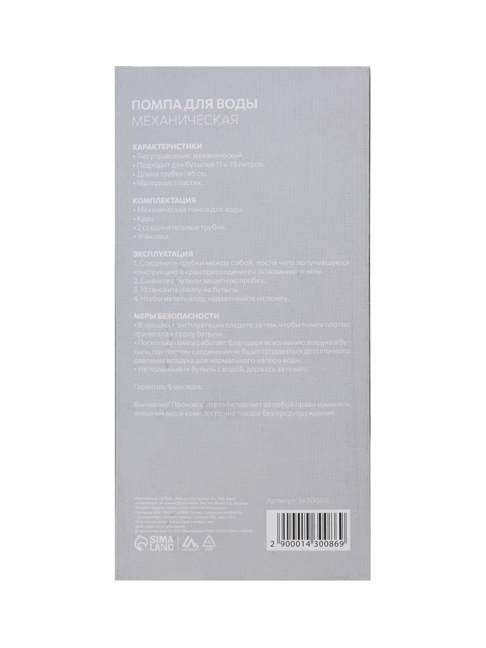 Вид: Помпа, Ручная Размер упаковки: 10 x 20 x 10 см. Цвет: Синий tnved: 8413200000 Гарантийный срок, мес.: 6 Длина трубки, см: 46 Механическая помпа Luazon это удобное устройство, которое поможет вам разливать воду быстро и просто. Наша компактная помпа заменит кулер, ведь её можно установить прямо на горлышко бутыли объёмом 11 - 19 л, не используя дополнительные детали. Принцип работы прост и понятен – после установки устройства на горлышко бутылки нажмите на большую кнопку сверху, чтобы насос начал перекачивать воду. Для работы устройству не потребуется доступ к розетке и другим источникам питания, ведь она работает от механического насоса. Поэтому помпа всегда будет готова к работе. Специальный клапан на кране поможет избежать протеканий. | ||