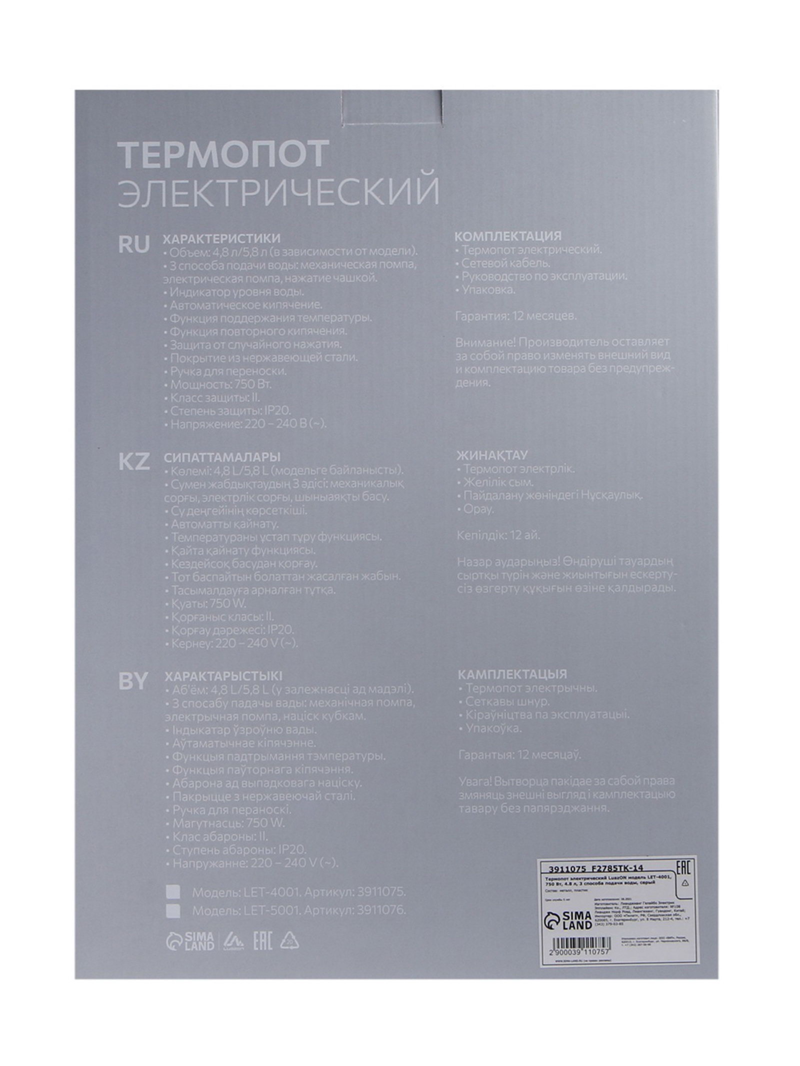 Размер упаковки: 26 x 39 x 26 см. tnved: 8516797000 Гарантийный срок, мес.: 12 Мощность, Вт: 750 Регулировка температуры: Нет Материал корпуса: Металл Цвет: Серый Вид подачи воды: Ручной Защита от перегрева: Нет Защита от включения без воды: Нет Повторное кипячение: Да Поддержание температуры: Да Индикатор уровня воды: Да Беспроводное использование: Нет