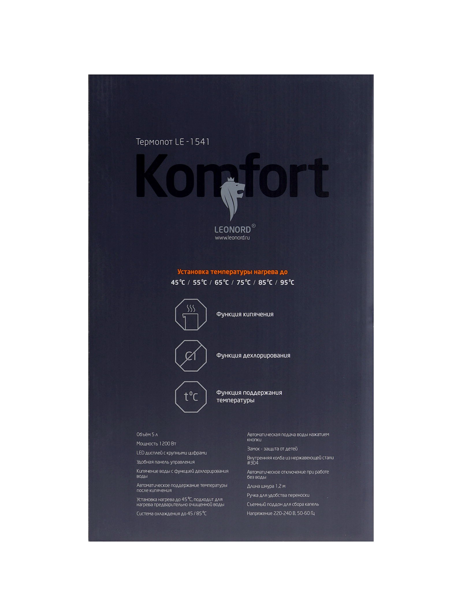 Размер упаковки: 26 x 42.5 x 33 см. tnved: 8516797000 Температурное ограничение: Нет Защита от включения без воды: Да Цвет: Белый Вид подачи воды: Автоматический Поддержание температуры: Да Беспроводное использование: Нет Материал корпуса: АБС-пластик Защита от перегрева: Да Регулировка температуры: Да Мощность, Вт: 1200 Термопот объёмом 5 л с мощностью 1 200 Вт и сенсорной панелью управления предлагает простой и комфортный доступ к горячей воде в любое время и без лишних усилий. Чёрный корпус подчёркивает современный дизайн, а электронный дисплей позволяет задавать и отслеживать температуру. Благодаря выбору из 8 режимов и функции автоматического поддержания температуры прибор адаптируется под любой напиток: от чая до крепкого кофе. Защита от запуска без воды и система защиты от перегрева обеспечивают безопасность при ежедневном использовании. | ||