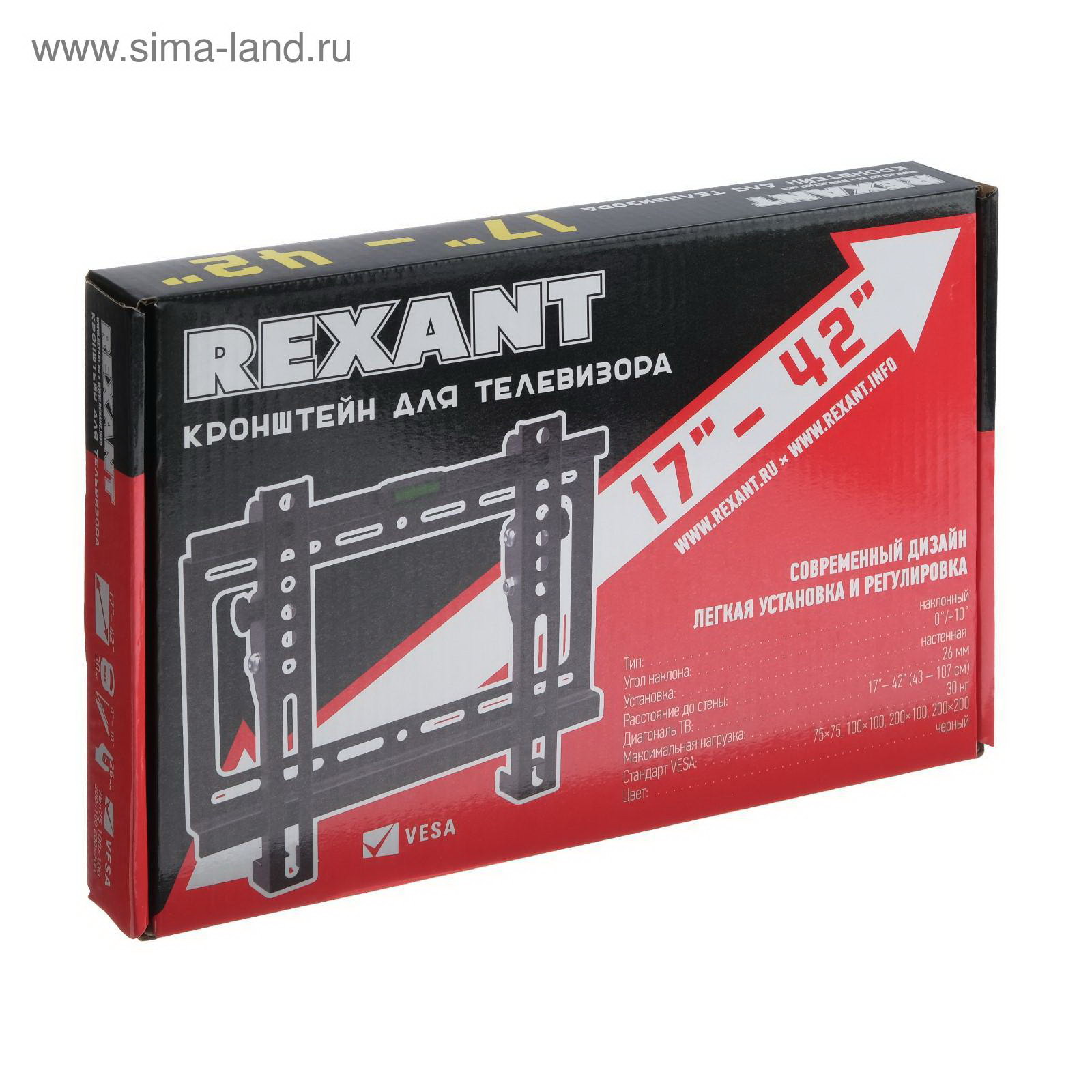Кронштейн 38-0320, для ТВ, наклонный, 17-42", 26 мм от стены, чёрный, REXANT, Китай