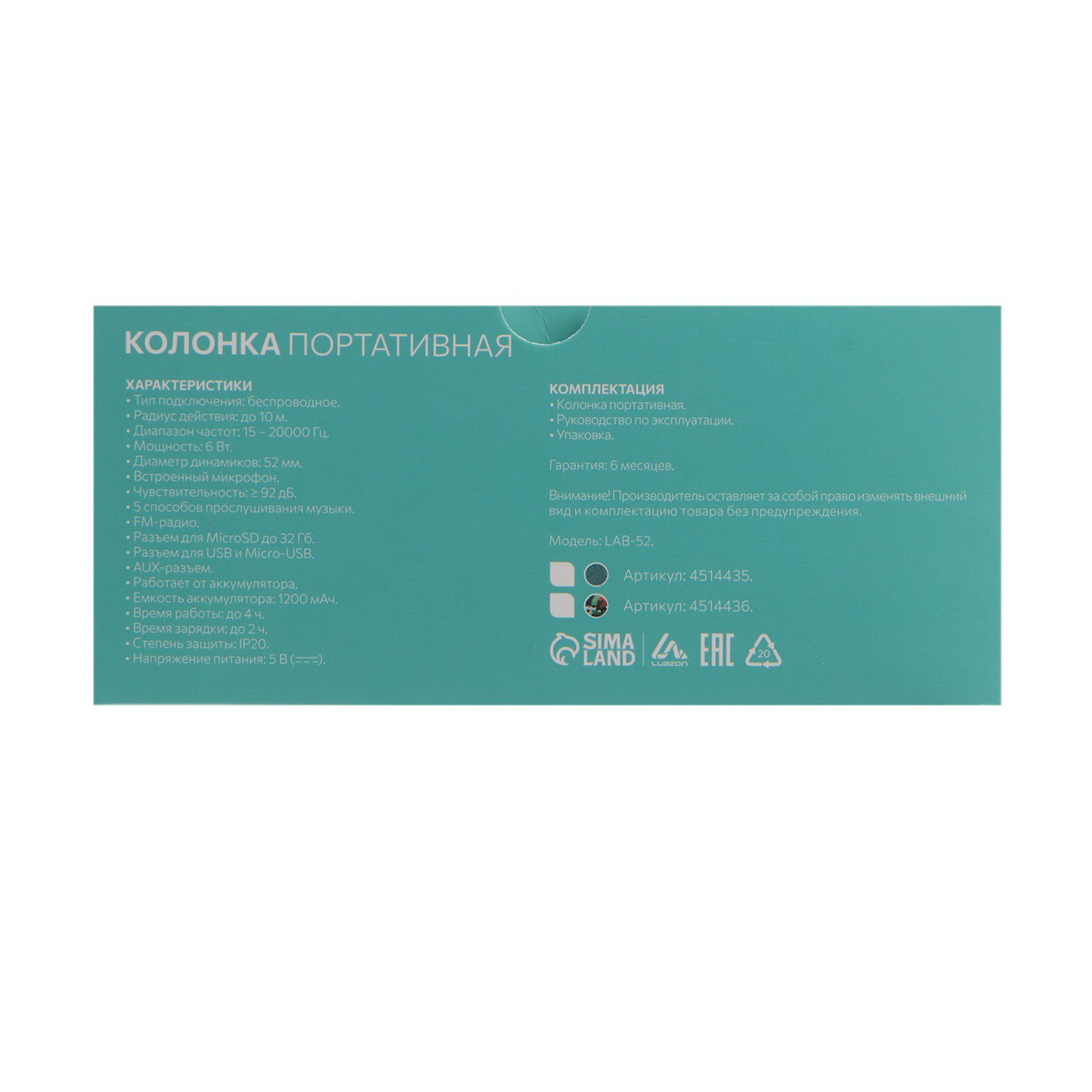 Портативная колонка Luazon LAB-52, 6 Вт, microSD, AUX, USB, зеленая, 7.5x7.5x16 см., Luazon Home, Китай