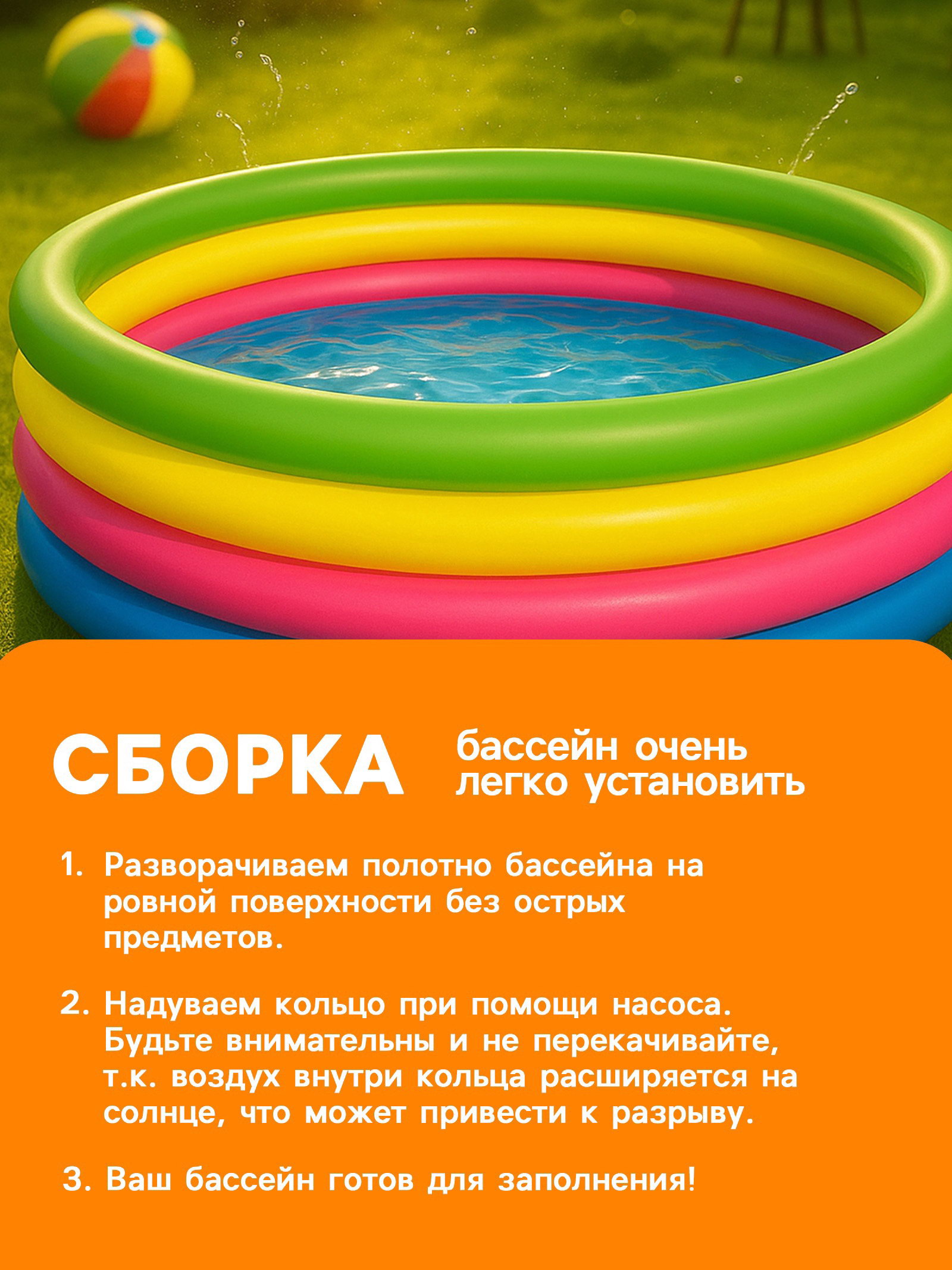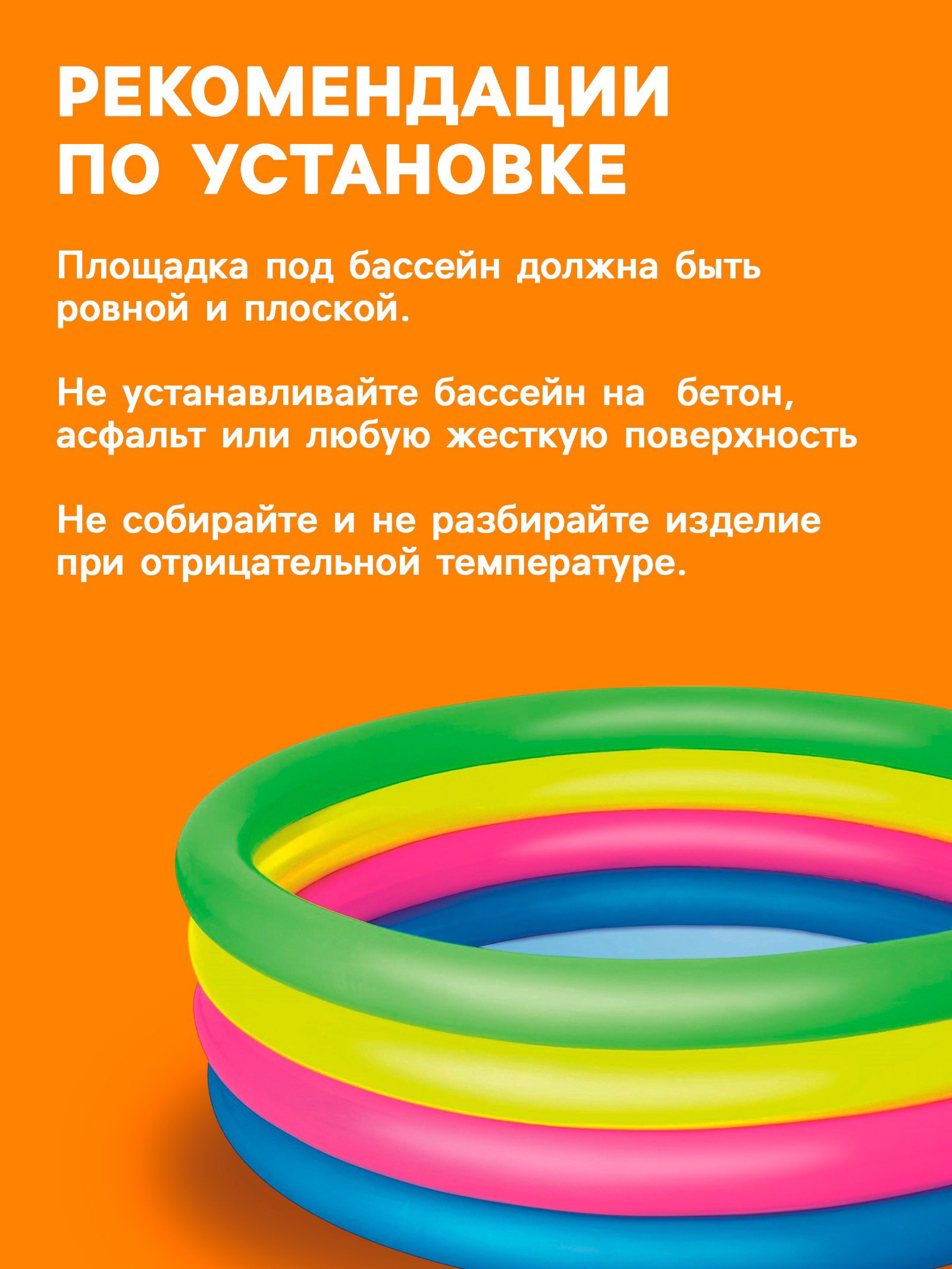 Размер упаковки: 30 x 30 x 7.5 см. Вид бассейна: Надувной Надувное дно: Нет Надувное дно: Нет tnved: 9506999000 Возраст: От 3 лет Высота, см: 46 Вес нетто, кг: 1.75 Тип: Бассейны Тип: Бассейны Ширина, см: 157 Длина, см: 157 Форма: Круглая Яркий бассейн предназначен для детей от трёх лет. С ним кроха сможет освежиться в жаркий день, а также поиграть, попускать кораблики, поплескаться с друзьями и побороть боязнь воды. Материал бассейна ПВХ, который устойчив к мелким повреждениям и солнечным лучам, а значит, будет радовать малыша не один сезон. Подарите радугу своему ребёнку! Характеристики