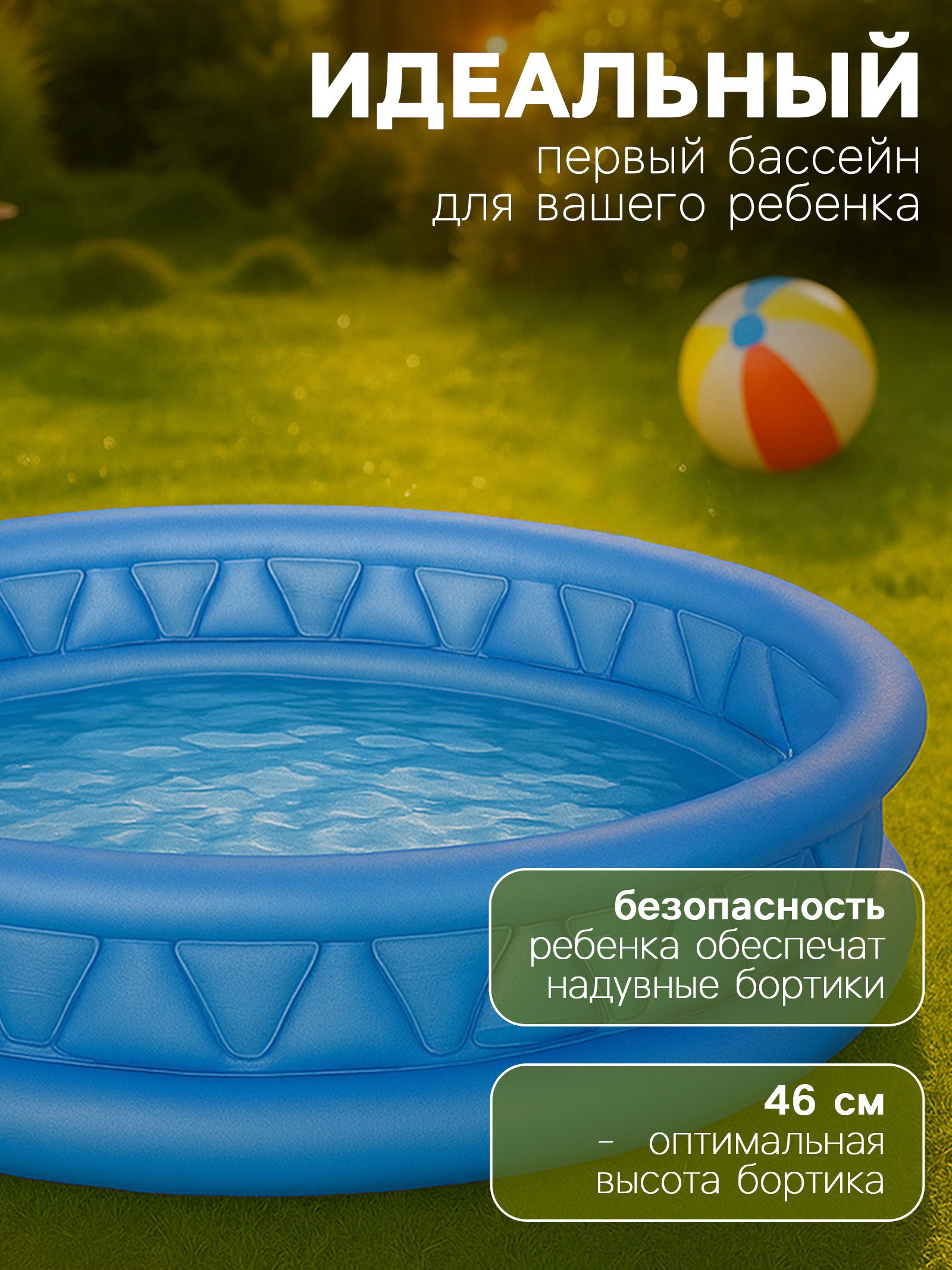 Размер упаковки: 35.5 x 9 x 30.5 см. Вид бассейна: Надувной Высота, см: 46 Надувное дно: Нет Надувное дно: Нет tnved: 9506999000 Возраст: От 3 лет Товар Каспи: Бассейны Тип: Бассейны Тип: Бассейны Форма: Круглая Длина, см: 188 Ширина, см: 188 Надувной бассейн сможет подарить малышу радость летом и зимой. Используйте этот бассейн в любое время года: летом на природе ребёнок может плескаться и радоваться брызгам, а зимой можно наполнить бассейн пластиковыми шариками и использовать его как игровой манеж. Материал ПВХ, из которого изготовлен бассейн, устойчив к повреждениям и ультрафиолетовым лучам, а значит, будет радовать малыша не один сезон. Особенности: