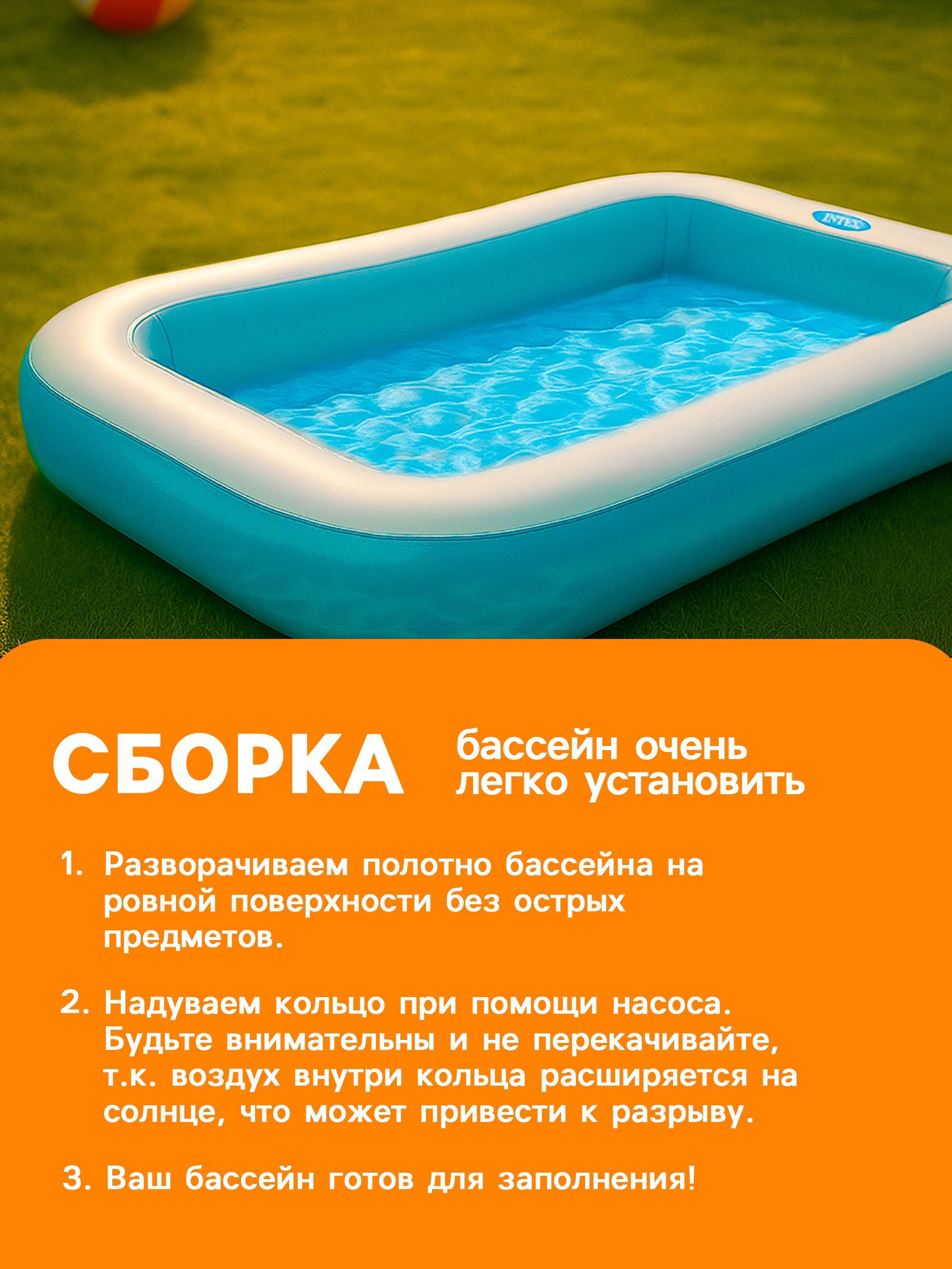 Внимание! Не устанавливайте детский бассейн на бетоне, асфальте или какой-либо другой жёсткой поверхности. Сливайте воду из бассейна, когда не пользуетесь им. | ||
