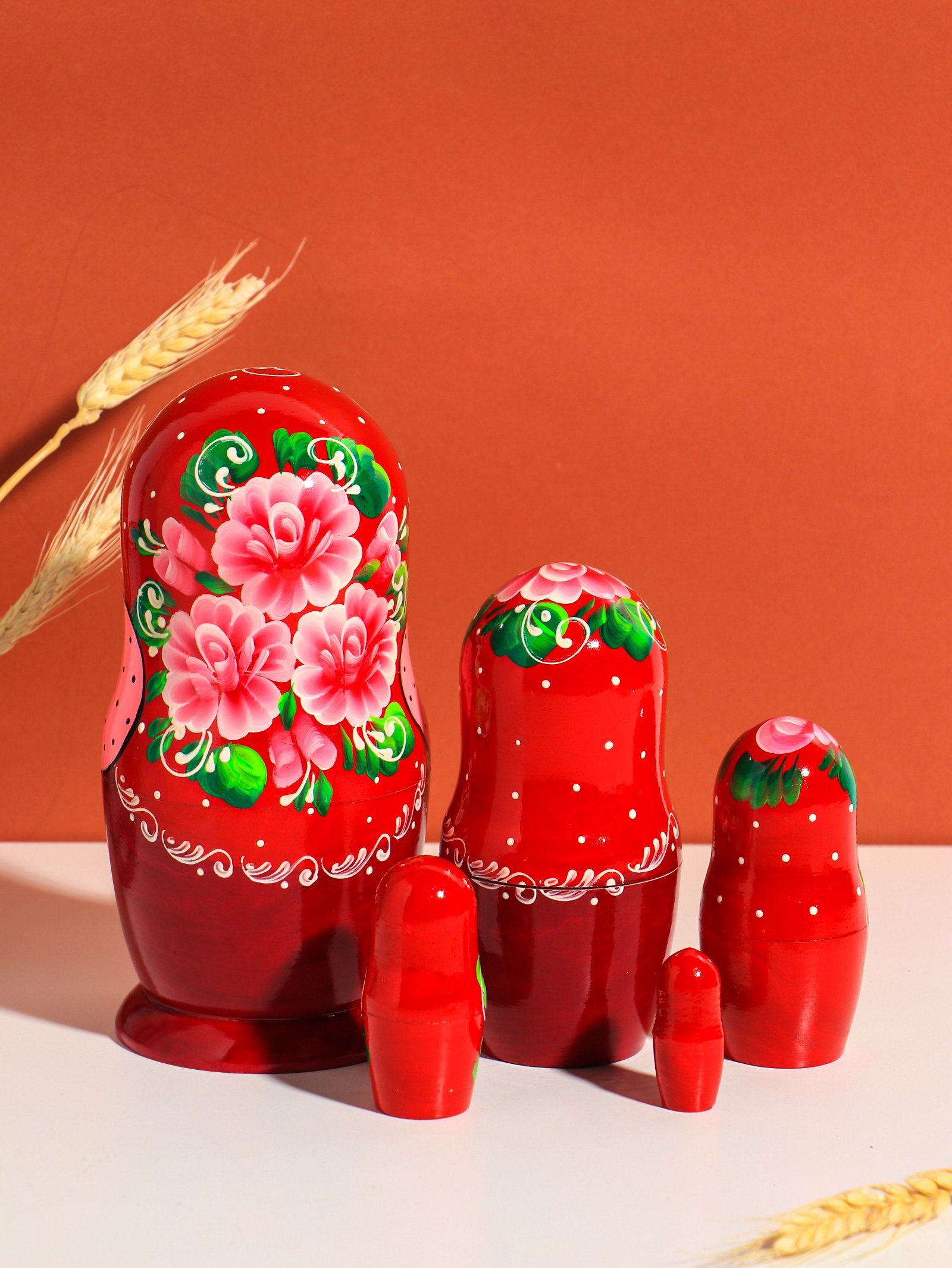 Матрешка дерево "Глаша", красное платье, розовые цветы, 18 см, 5 кукольная, ручная роспись, Россия