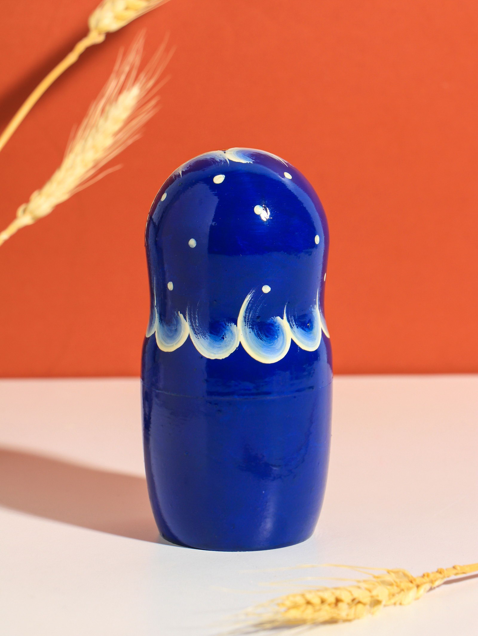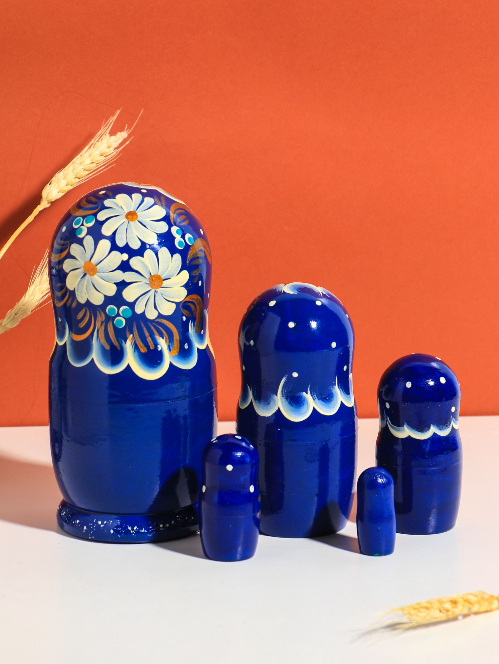 Матрешка дерево "Настёна", синее платье, белые цветы, 18 см, 5 кукольная, ручная роспись, Россия