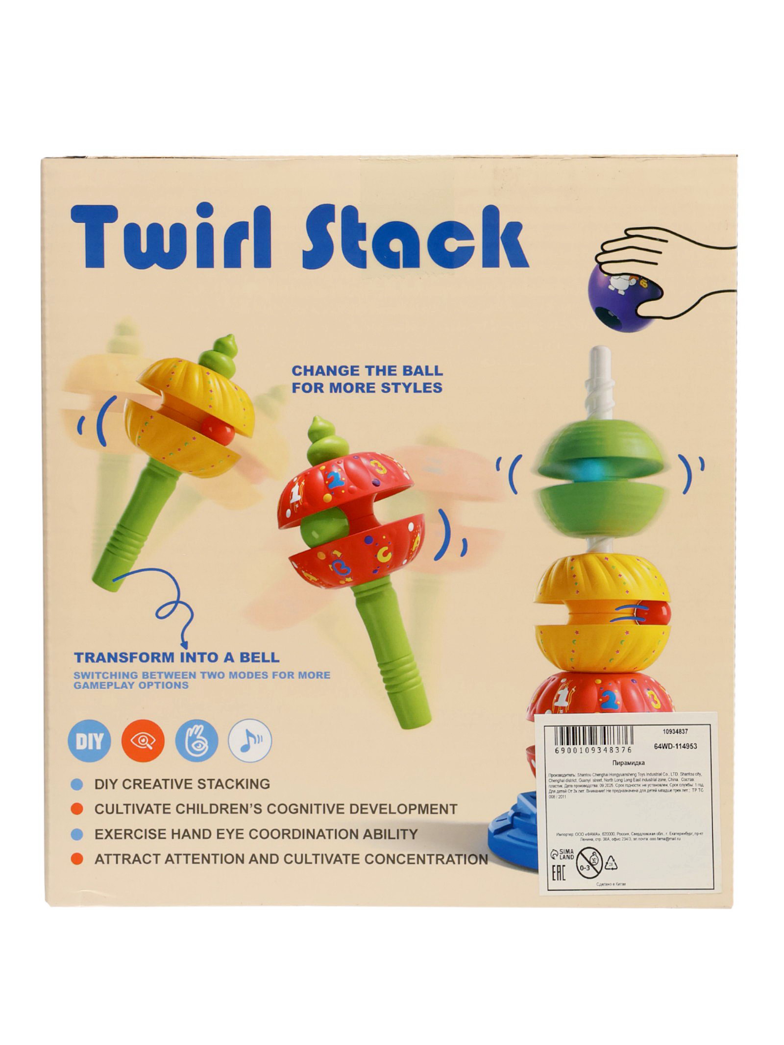 Размер упаковки: 14.6 x 18.5 x 17 см. tnved: 9503007000 Вид пирамидки: Логическая Возраст: От 3 лет Высота, см: 37 Для кого: Унисекс Развивающая пирамидка "Закрути шарик" яркая интерактивная игрушка, которая превращает обычную сборку пирамидки в динамичную игру. Объёмные половинки деталей легко насаживаются на стержень, вращаются, скатываются и создают эффект движущейся башни. Высота конструкции 37 см, что делает её удобной для игры детям от 3 лет. Особенности: