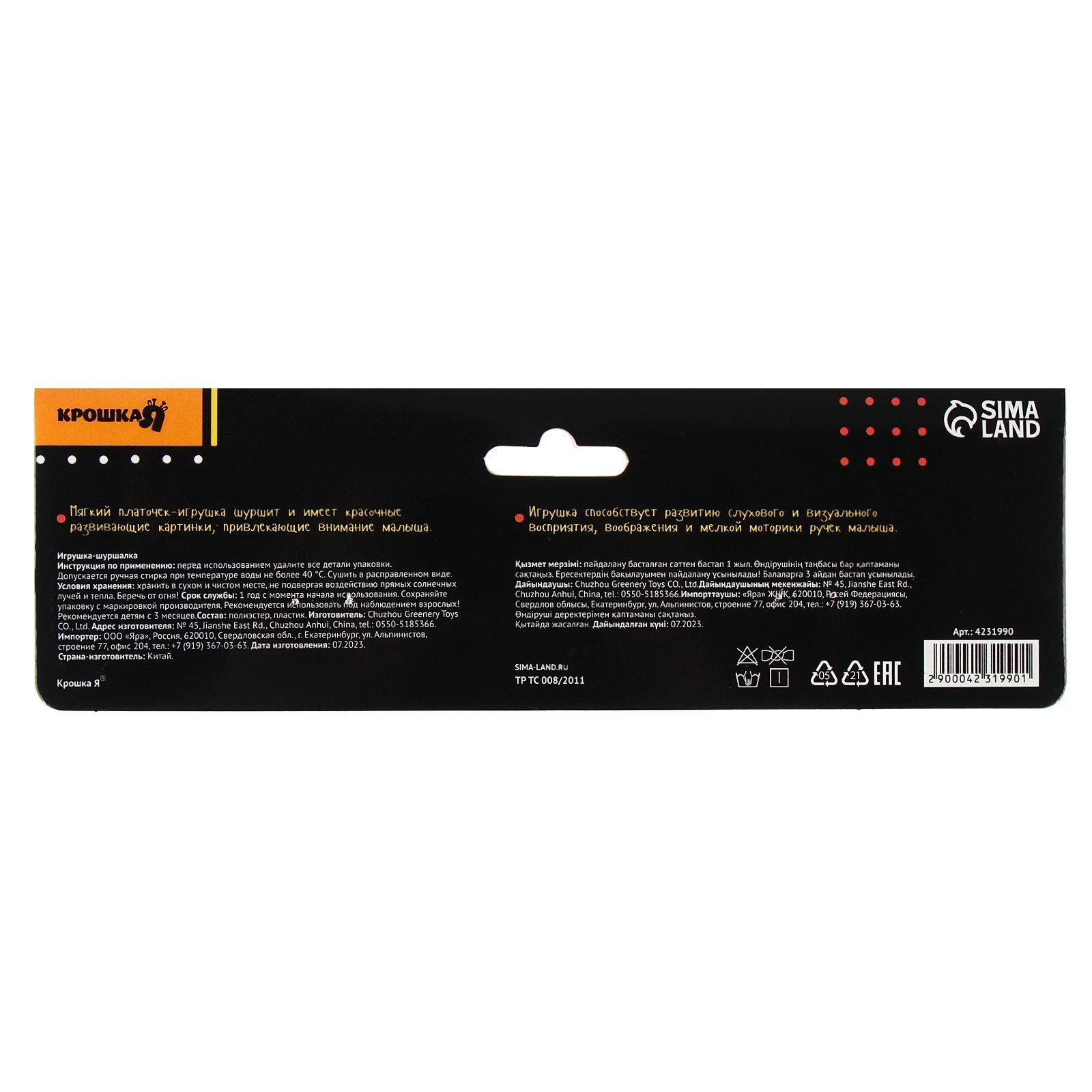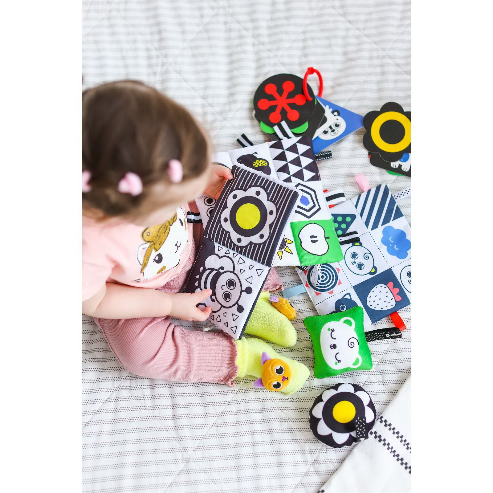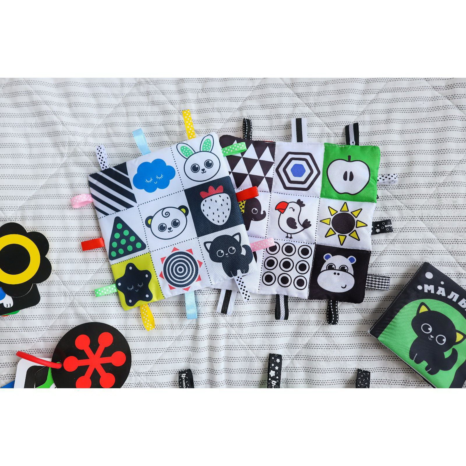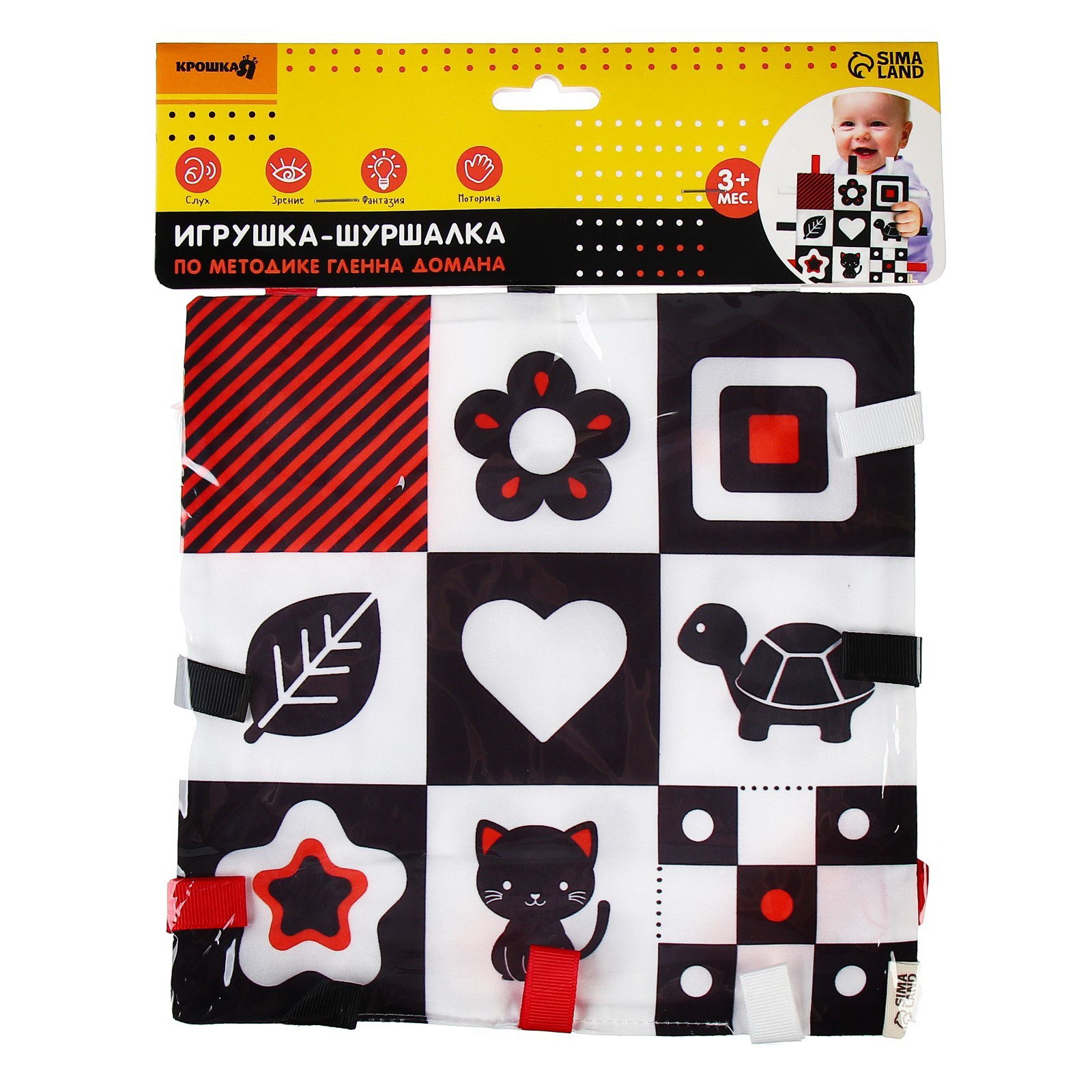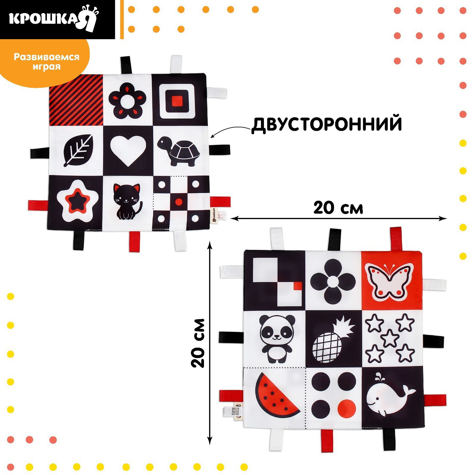 Небольшой размер 20x20 см позволяет брать игрушку на прогулки. Легко стирается, сохраняя форму. Подходит для детей с 3 месяцев – станет первой развивашкой в коллекции малыша. Подарите крохе полезный аксессуар, который сочетает игру и развитие. | ||