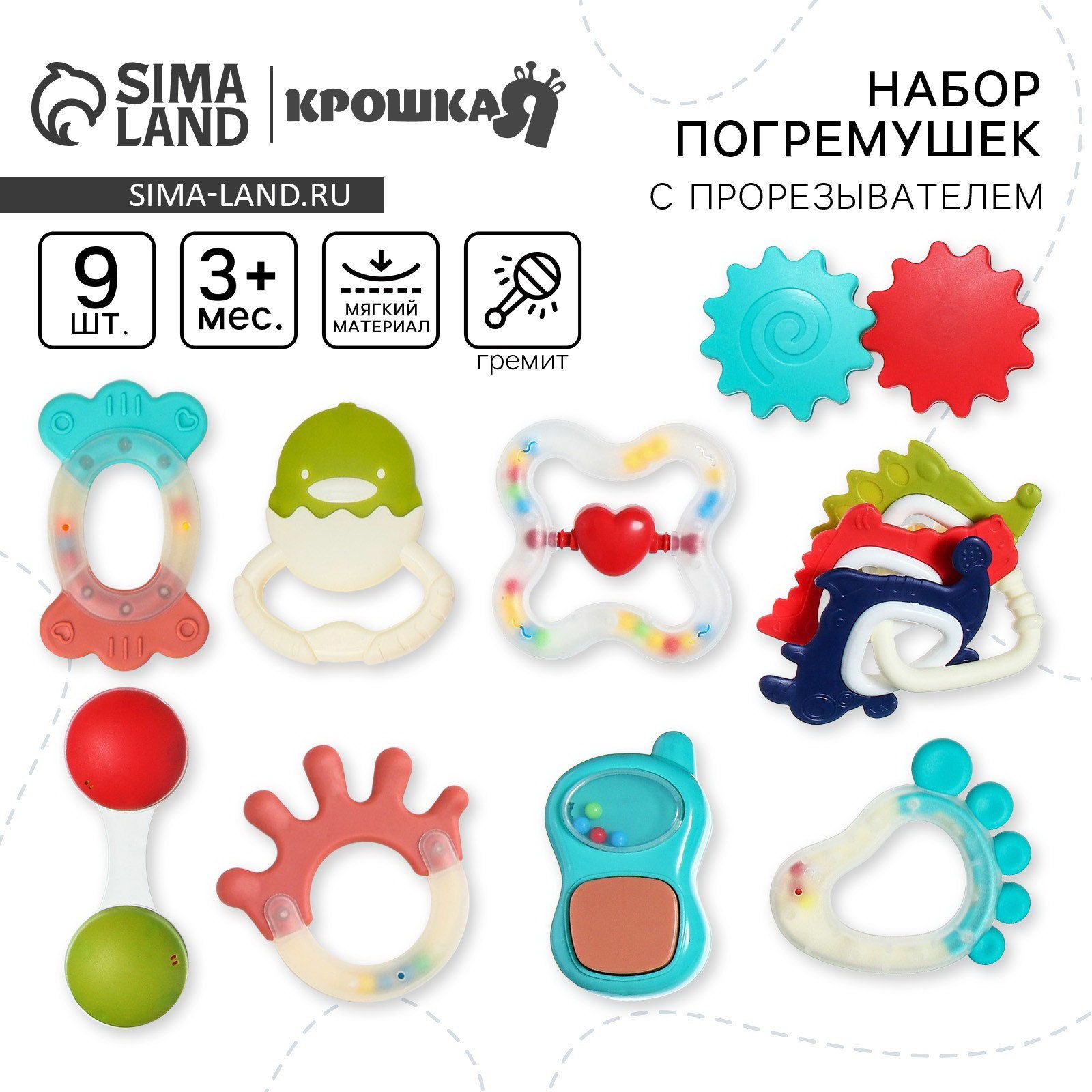 Развивающие элементы: Звуковые эффекты, Прорезыватель Особенности: Звуковые эффекты, Развивающая Дополнительные функции: Звуковые эффекты, Развивающая Длина, см: 9, 12.5 Ширина, см: 4.5, 6 Глубина, см: 1, 3.5 Размер упаковки: 11 x 28 x 6 см. Цвет: Разноцветный Для кого: Унисекс Русская упаковка: Да tnved: 9503007000 Возраст: От 3 месяцев Набор: Да Погремушки - это не просто игрушки, это ключевой элемент в развитии малыша. Они помогают развивать мелкую моторику, зрительное и слуховое восприятие и улучшают координацию движений. В нашем наборе вы найдете разнообразные погремушки с силиконовыми прорезывателями, которые помогут малышу справляться с режущимися зубками. Мягкий силикон без острых углов обеспечивает безопасность и комфорт для ребенка. Особенность наших погремушек - это тихий и нежный звук, который не раздражает ушки малыша, а наоборот, успокаивает и развлекает. Легкий вес игрушек и удобная форма делают их идеальными для детских ручек. Дарите своему малышу игрушку, которая не только привлекает его внимание, но и способствует его развитию | ||