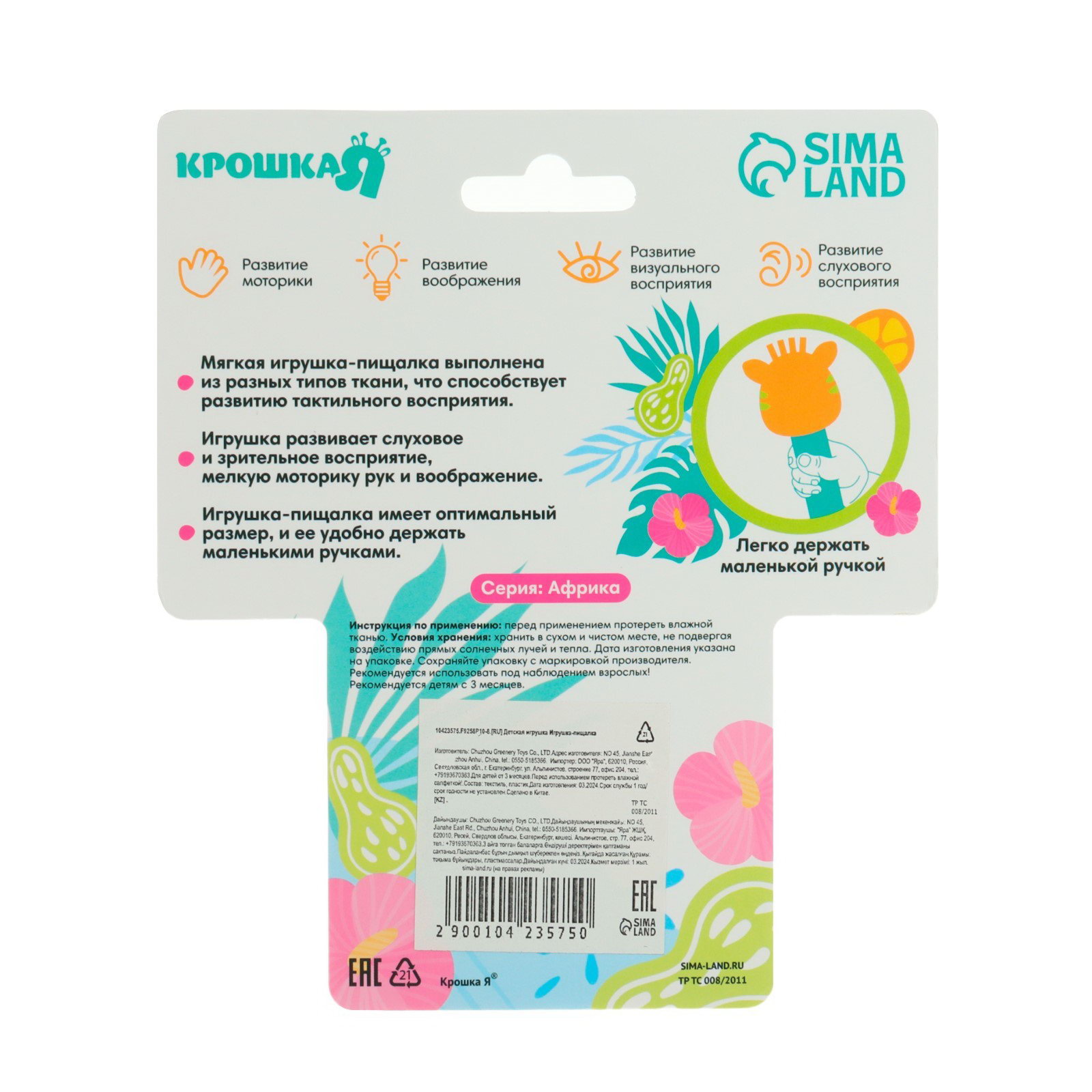Цвет: Жёлтый, Оранжевый Дополнительные функции: Звуковые эффекты, Развивающая Размер упаковки: 16 x 4 x 26 см. Возраст: От 3 месяцев Набор: Нет Особенности: Звуковые эффекты Для малышей: Да Для кого: Унисекс Для кого: Унисекс tnved: 9503010000 Игрушка- пищалка с первых месяцев жизни малыша станет прекрасной развивающей игрушкой вашего ребенка. Игрушку пищалку удобно держать маленькими пальчиками, что развивает мелкую моторику рук. Яркий и приятный образ поможет развить сенсорное восприятие цвета, формы и фактуры. Мягкий звук при сдавливании пищалки активизирует слуховые анализаторы и способствует концентрации внимания. • Игрушка пищит • Яркая, приятная на ощупь ткань • Милые современные образы • Изготовлено из гипоаллергенных материалов. • В упаковке 1 игрушка | ||