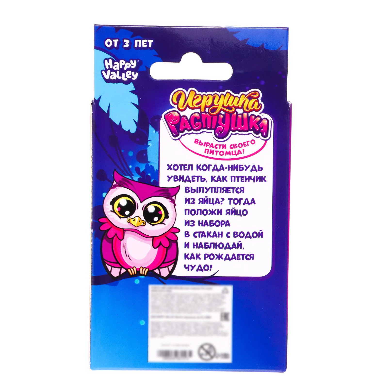 Размер упаковки: 5 x 13 x 8 см. tnved: 9503005000 Возраст: От 3 лет Для кого: Унисекс Дополнительные функции: Развивающая Вид упаковки: Коробка картонная Игрушка-растушка поможет крохе вырастить своего питомца. Следуйте инструкции, и у вас всё получится! Положите яйцо в стакан с водой. Наблюдайте за ним в течение 8 суток. Помогите птенчику вылупиться и поиграйте с ним! Набор рекомендован детям старше 3 лет. В состав входят картон и полимер. Материалы абсолютно безопасны для малыша. Играйте и познавайте мир вместе с нами! | ||