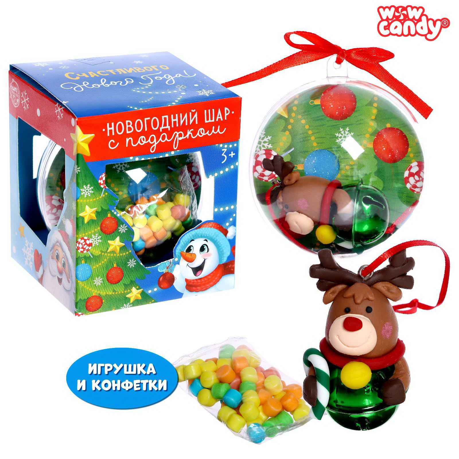 Новогодний шар "Оленёнок", игрушка с конфетами, 8x8x8.5 см., WOW Candy, Китай