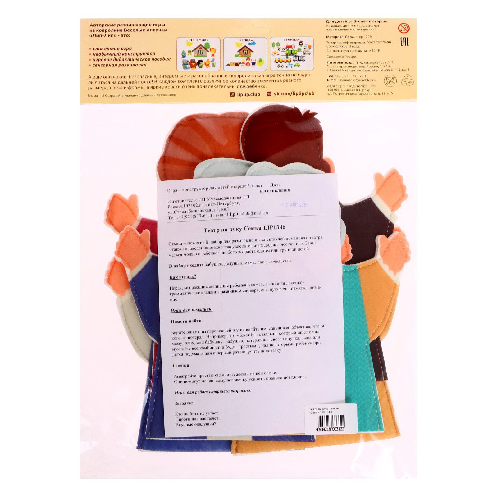 Размер упаковки: 29 x 3 x 30 см. tnved: 9504908000 Для кого: Унисекс Температурное ограничение: Нет Возраст: От 3 лет Набор: Да Вид: Пальчиковые Вид игрушки: Сказки Игра-конструктор "Семья" добрая развивающая игра, которая помогает ребёнку познакомиться с близкими людьми и понять, кто есть кто в семейном кругу. Фигурки легко соединяются между собой, поэтому ребёнок может самостоятельно собирать "семью", менять персонажей местами, придумывать истории и разыгрывать повседневные ситуации: прогулки, разговоры, праздники. Игра способствует спокойному, осознанному взаимодействию и развивает эмоциональную сферу. Яркие, дружелюбные образы помогают ребёнку легче воспринимать новые понятия и вовлекают в сюжетную игру без перегрузки деталями. Особенности