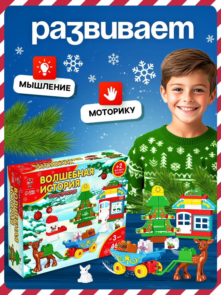 Размер упаковки: 8.3 x 26 x 30 см. Для кого: Унисекс Размер деталей: Классические детали tnved: 9503004000 tnved: 9503004000 Количество элементов: 46 Тематика конструктора: Новогодняя Возраст: От 3 лет Вид: Для малышей Тематика праздника: Новый год Количество минифигур: 2 Животное восточного календаря: Кролик Уровень сложности: Начальный Среднее время сборки, мин: 30 Новогодние истории Маленькому любителю волшебства непременно понравится новогодний конструктор. С ним ребёнок не только воспроизведёт праздничный сюжет, но и сможет придумать свои истории. Функциональные особенности Игровой набор содержит 46 деталей и инструкцию по сборке. Элементы изготовлены из высококачественной пластмассы, надёжно соединяются между собой и разбираются без особого труда. Набор совместим с конструкторами LEGO, Ausini, QMAN, JISI BRICKS и другими аналогами. Неоспоримая польза Игры с конструктором разовьют у ребёнка мелкую моторику, внимательность, воображение, логическое и образное мышление. | ||