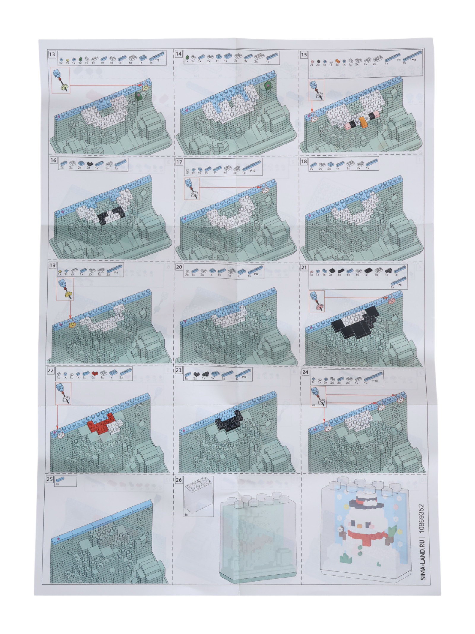 Размер упаковки: 8 x 12.5 x 11.5 см. tnved: 9503004000 Количество элементов: 419 Среднее время сборки, мин: 200 Для кого: Унисекс Уровень сложности: Средний Возраст: От 6 лет Размер деталей: Мини блоки Создай зимнее чудо из миниатюрных деталей! Конструктор "Снеговичок" это набор для сборки новогоднего персонажа из мелких блоков. Ребёнок шаг за шагом соберёт объёмную фигурку, развивая терпение и внимание к деталям.