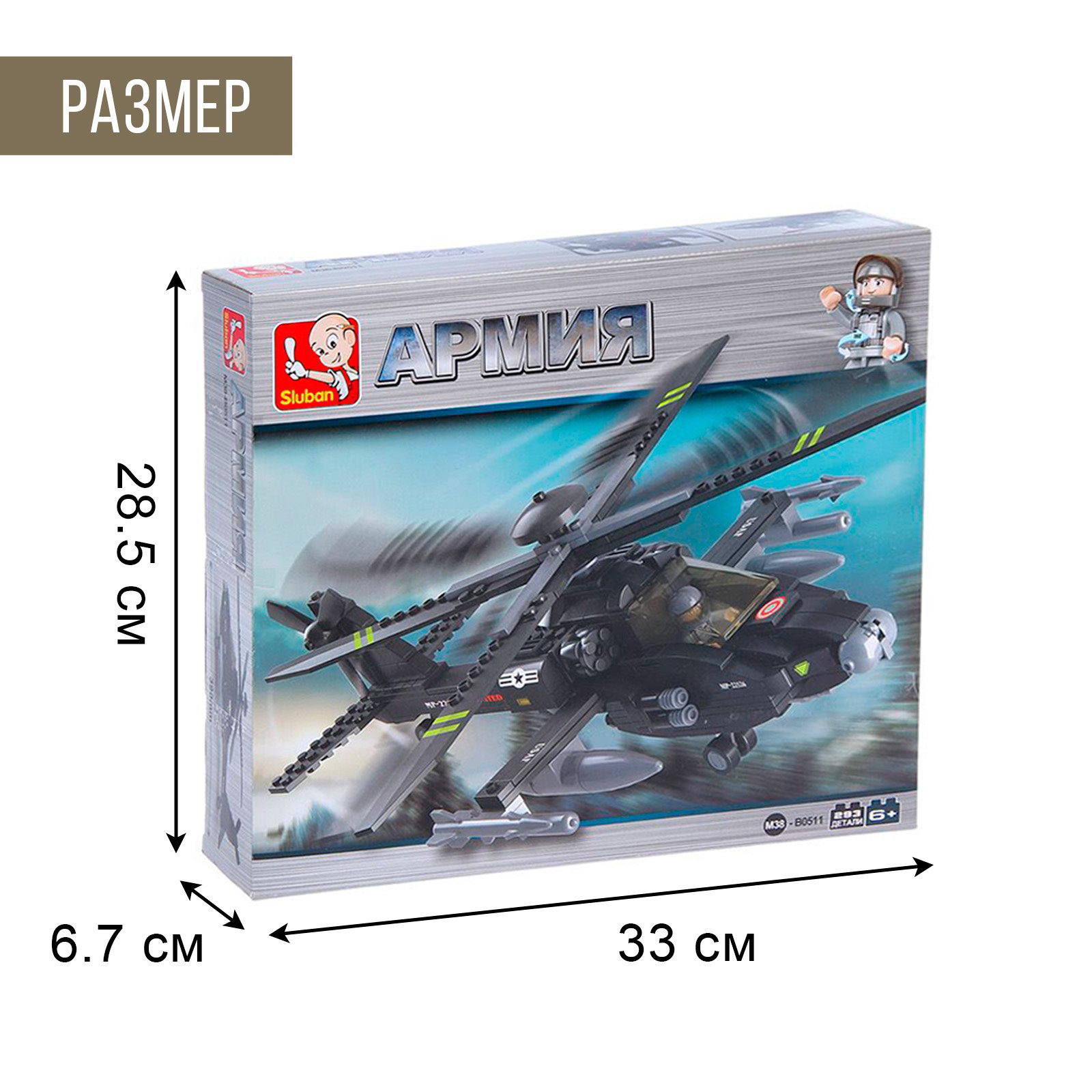 Размер упаковки: 6.7 x 28.5 x 33 см. Русская упаковка: Да Тематика конструктора: Военные Для кого: Для мальчика Возраст: От 6 лет Количество элементов: 293 Размер деталей: Классические детали tnved: 9503004000 tnved: 9503004000 Тематика праздника: 23 Февраля Среднее время сборки, мин: 150 Уровень сложности: Средний Тип механизма: Без механизма Вид транспорта: Вертолёт Создаём спасательный отряд В городе развернулись настоящие военные действия, солдаты не справляются с мощью противника, необходимо немедленное подкрепление. Спасите свою армию, сконструировав штурмовой вертолёт, а затем атакуйте противника с воздуха, поддерживайте наземные войска и боритесь с бронетехникой. Особенности Набор содержит 293 детали и позволяет собрать ударный летательный аппарат и фигурку солдата. Подвижные элементы разнообразят игровые сюжеты, мальчишка выстроит стратегию и одержит победу в битве! Детали изготовлены из высококачественной пластмассы, надёжно соединяются между собой и разбираются без особого труда. Типовые элементы конструктора совместимы с наборами Ausini, Brick, Sluban, Cogo , Lego, Peizhi, Jie Star и Unicon. Объединяйте, фантазируйте и создавайте новое! Неоспоримая польза В процессе игры ребёнок получит конструкторские навыки, разовьёт образное и логическое мышление, станет внимательнее и усидчивее. Длина вертолёта в собранном виде: 39 см Для детей старше 6 лет. | ||