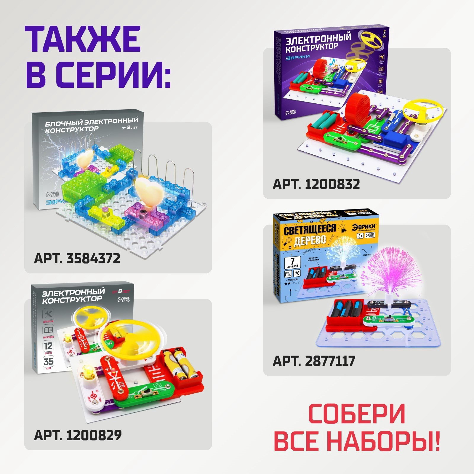 Размер упаковки: 8.5 x 15 x 13 см. Игрушка с видео: Да Возраст: От 5 лет Количество элементов: 15 Для кого: Унисекс tnved: 9503004000 tnved: 9503004000 Типоразмер батареек: AA (LR6) Работает от батареек: Да Количество батареек: 2 Тематика конструктора: Опыты Тип питания: От батареек Батарейки в комплекте: Нет Вид исследований: Электричество Вид науки: Физика Количество опытов: 4 Вид конструктора: Электронный Электронный конструктор для научных экспериментов это интерактивный набор, который поможет ребёнку разобраться в основах физики, электроники и механики. С его помощью можно провести увлекательные опыты, собрав работающие устройства. Что можно собрать?