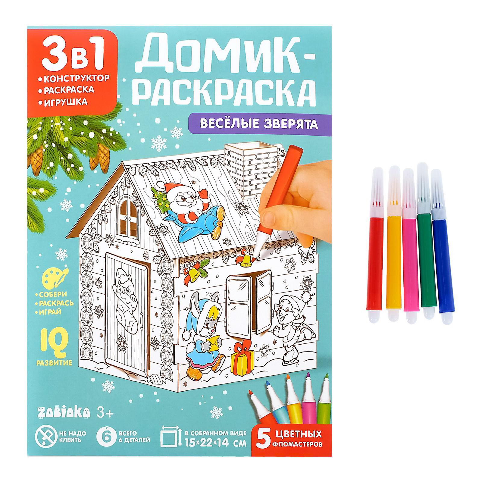 Домик-раскраска 3 в 1 "Весёлые зверята", 5 фломастеров, 6 деталей, 22x15x14 см., ZABIAKA, Китай