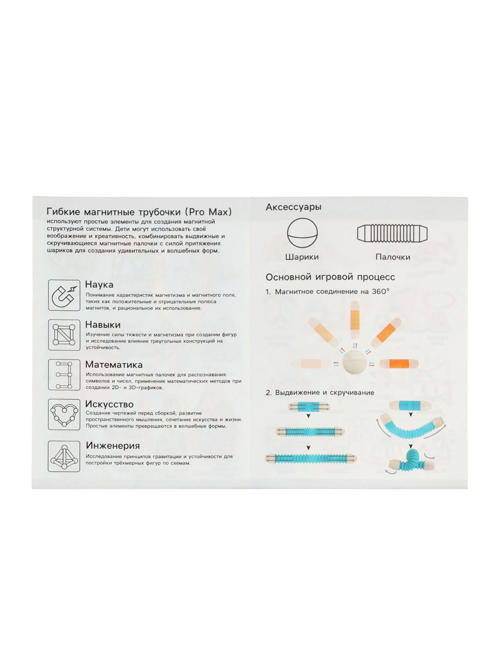 Конструктор тренирует пространственное мышление, логику и мелкую моторику. Он подходит для детей от трёх лет и служит инструментом для первого знакомства с геометрическими формами и магнетизмом. Игра с магнитными трубами это сочетание обучения и творчества. | ||