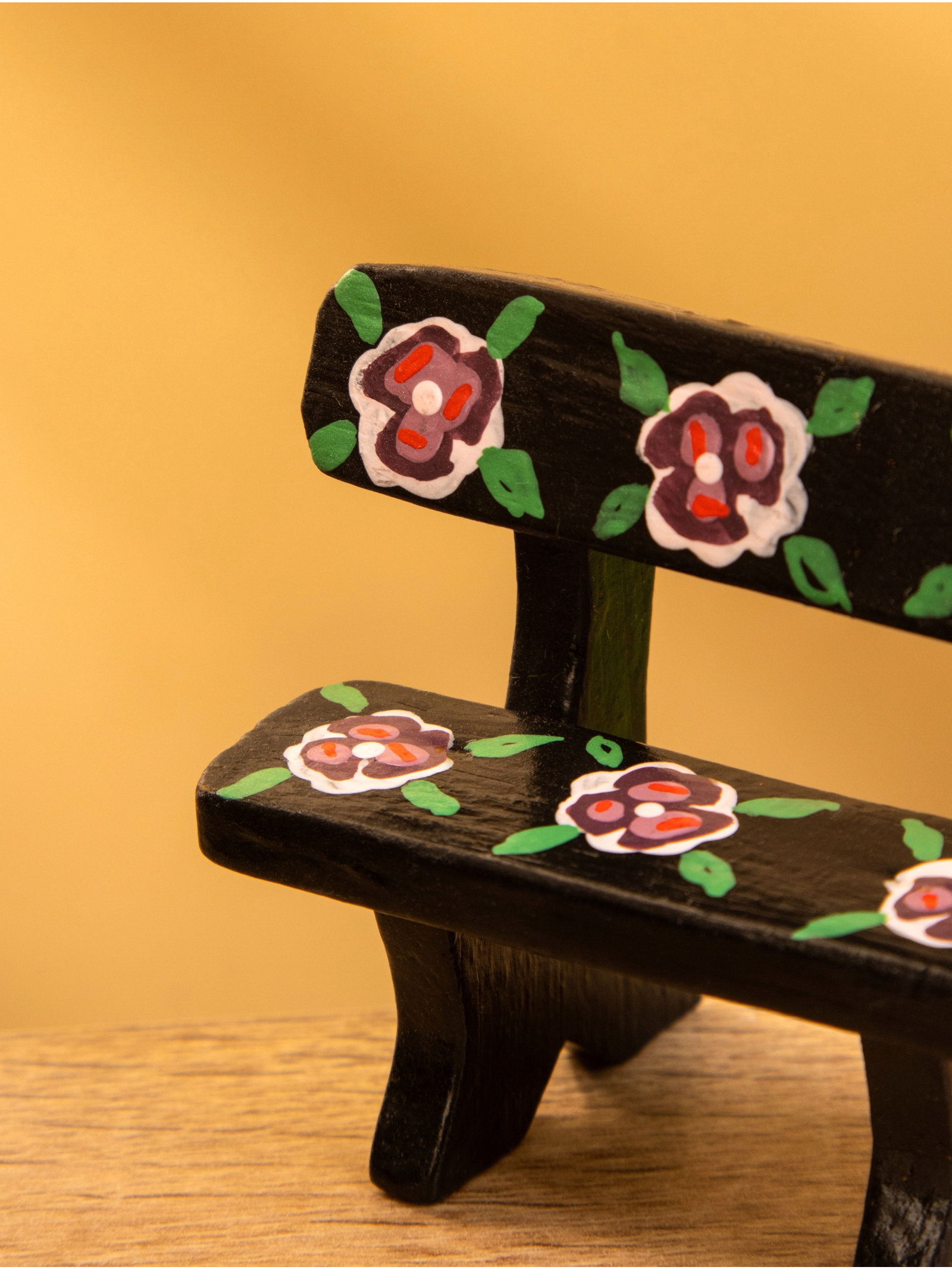 Мебель для кукол "Скамейка с цветами", 6.5x3.5x6 см, дерево, чёрная, 3.5x6.5x6 см., Индонезия