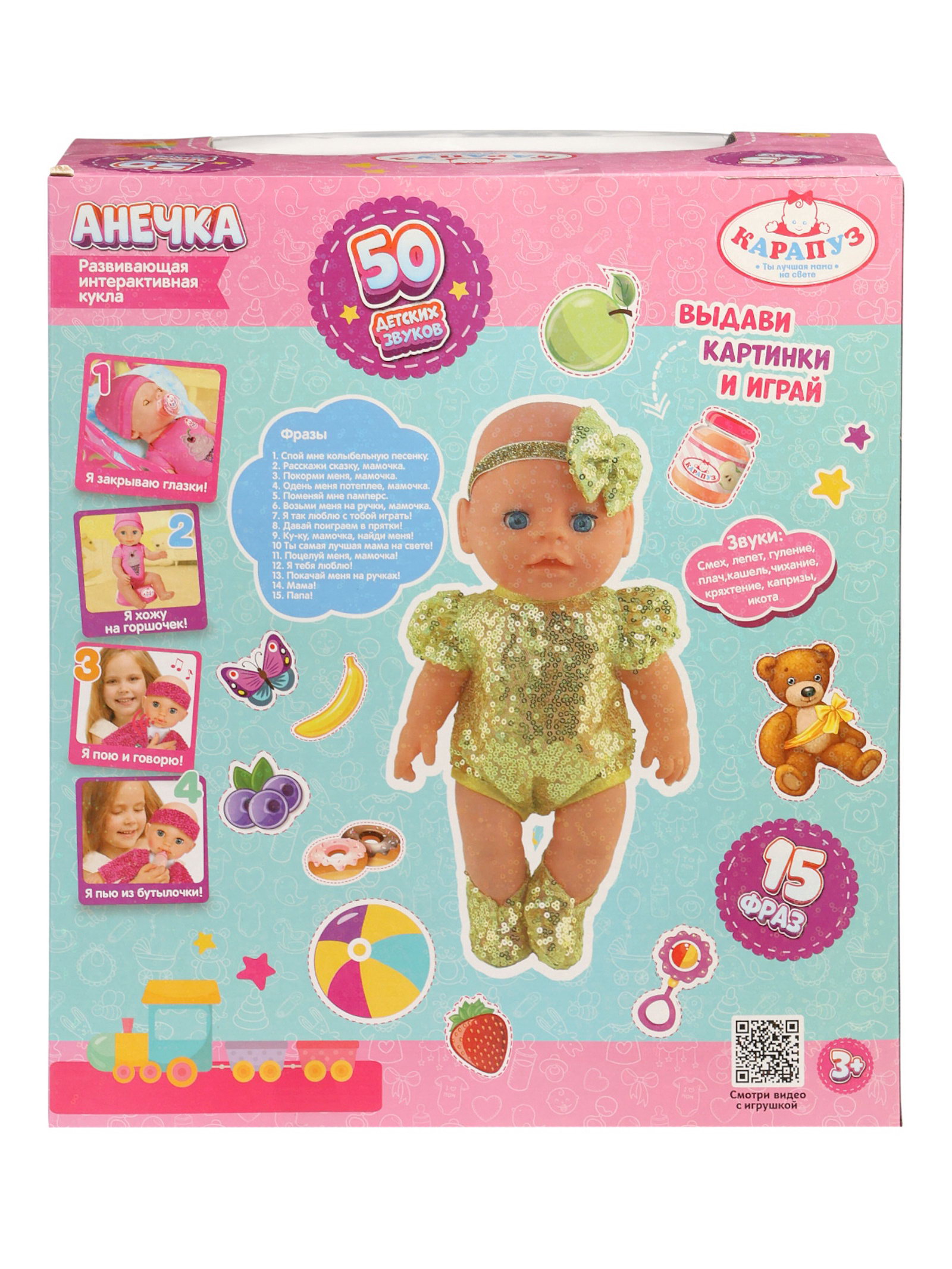 Дополнительные функции: Интерактивная, Развивающая Особенности куклы: Закрывает глаза, Звуковые функции, Писает, Пьёт Вид: Куклы, Пупс Комплектация: С бутылочкой, С горшком Размер упаковки: 33.5 x 17 x 38 см. tnved: 9503007000 Температурное ограничение: Нет Пол куклы: Девочка Количество батареек: 3 Интерактивные функции: Датчик звука Типоразмер батареек: LR44 (V13GA, AG13, LR1154, SR44) Высота, см: 40 Звук: Да Для кого: Для девочки Батарейки в комплекте: Да Вид упаковки: Коробка картонная Возраст: От 3 лет "Анечка" это игровая кукла-малышка, с которой ребёнок может по-настоящему ухаживать и общаться. Она пьёт из бутылочки, ходит на горшок, закрывает глазки и озвучивает около 50 естественных детских звуков. Ребёнок пробует роль заботливого родителя, учится проявлять внимание и нежность, а игра становится понятной и близкой к реальной жизни. Кукла реагирует на действия: когда её укладывают, она закрывает глаза, когда поят из бутылочки потом "писает", может смеяться, лепетать или хныкать. Звуки радости и недовольства помогают ребёнку лучше понимать эмоциональные реакции и вовлекаться в игру охотнее. Особенности
