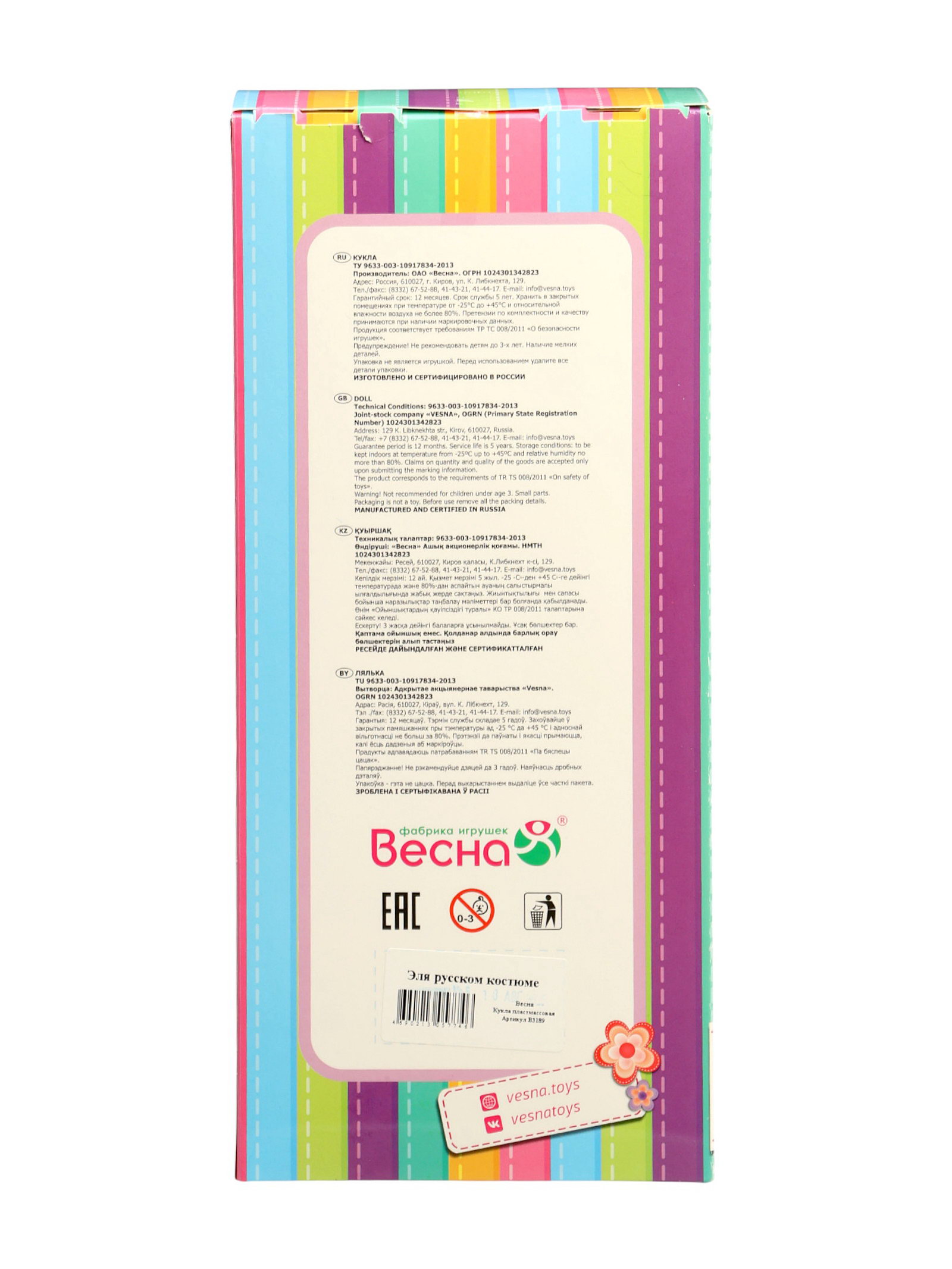 Особенности куклы: Закрывает глаза, Можно купать, Можно причесывать Размер упаковки: 15 x 10 x 34 см. Для кого: Для девочки tnved: 9503002000 Температурное ограничение: Нет Пол куклы: Девочка Вид упаковки: Коробка Возраст: От 3 лет Высота, см: 30.5 Вид: Классическая Кукла "Эля" в русском костюме из серии "Этно" станет настоящей подружкой для вашего ребёнка. Погрузитесь в удивительный мир народной культуры России с помощью этой куклы! Она одета в стилизованный национальный костюм, который придаёт ей особый шарм и очарование. В комплект национальной одежды куклы входит: