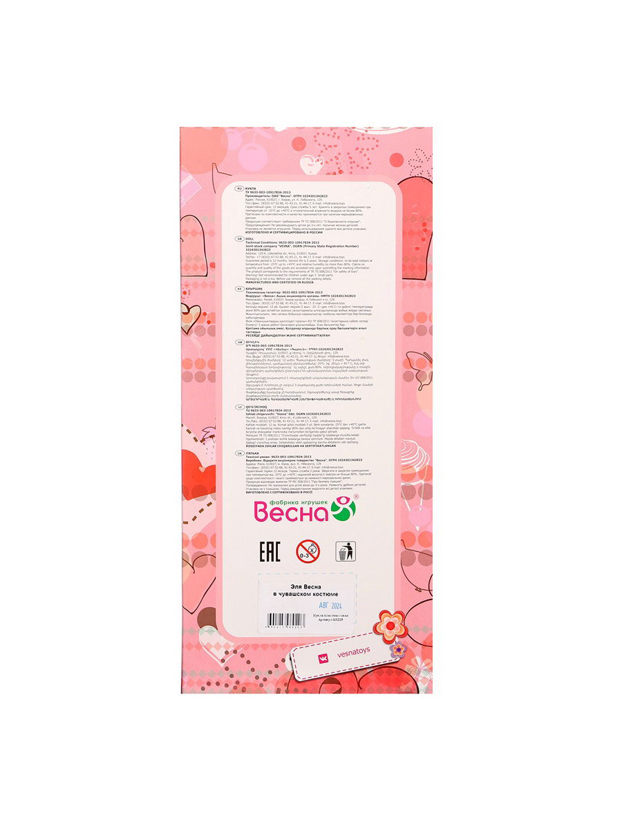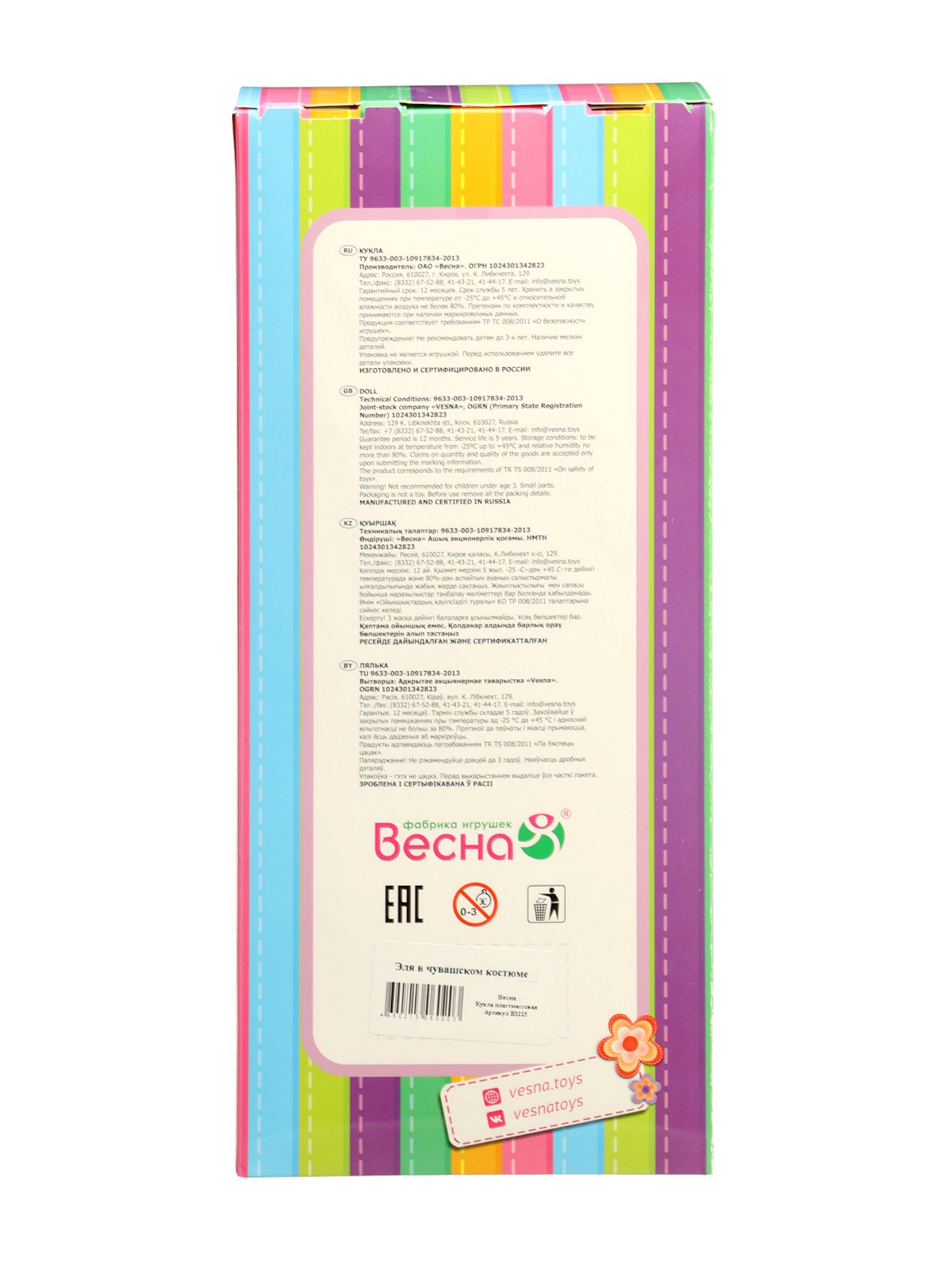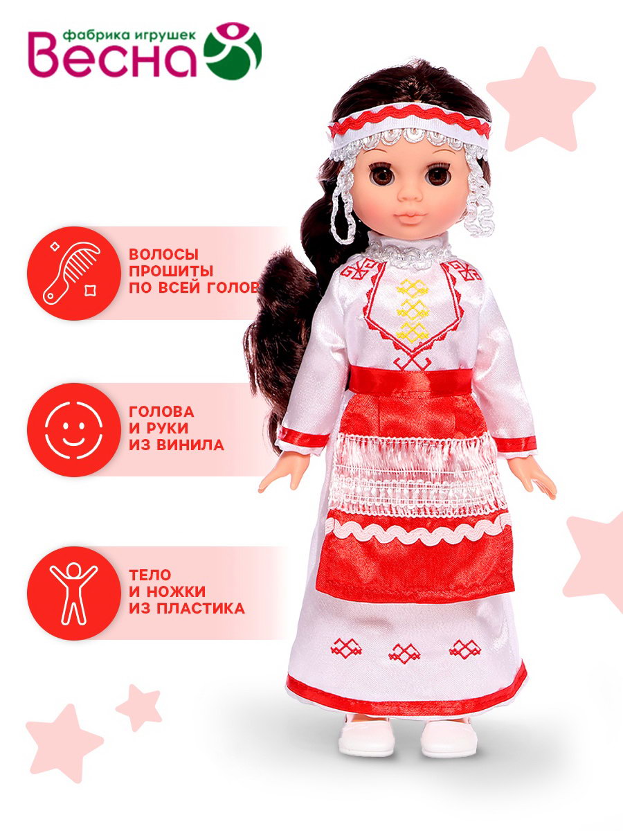 Размер упаковки: 15 x 9.5 x 34.5 см. Для кого: Для девочки tnved: 9503002000 Температурное ограничение: Нет Пол куклы: Девочка Вид упаковки: Блистер Особенности куклы: Без особенностей Высота, см: 30.5 Возраст: От 3 лет Вид: Классическая Кукла "Эля в чувашском костюме" станет настоящей подружкой для ребёнка. Кукла одета в стилизованный национальный костюм Республики Чувашия. Особенности