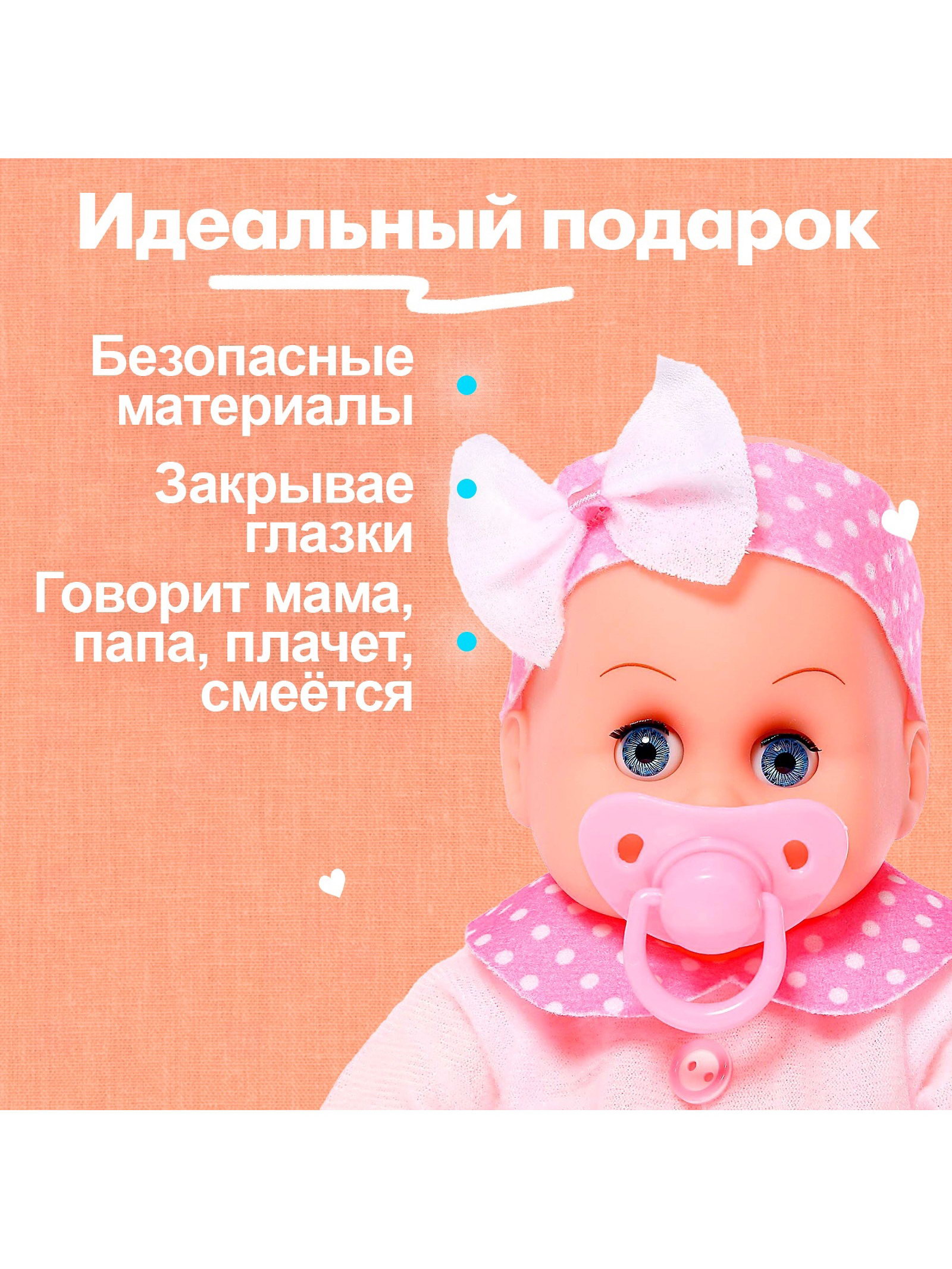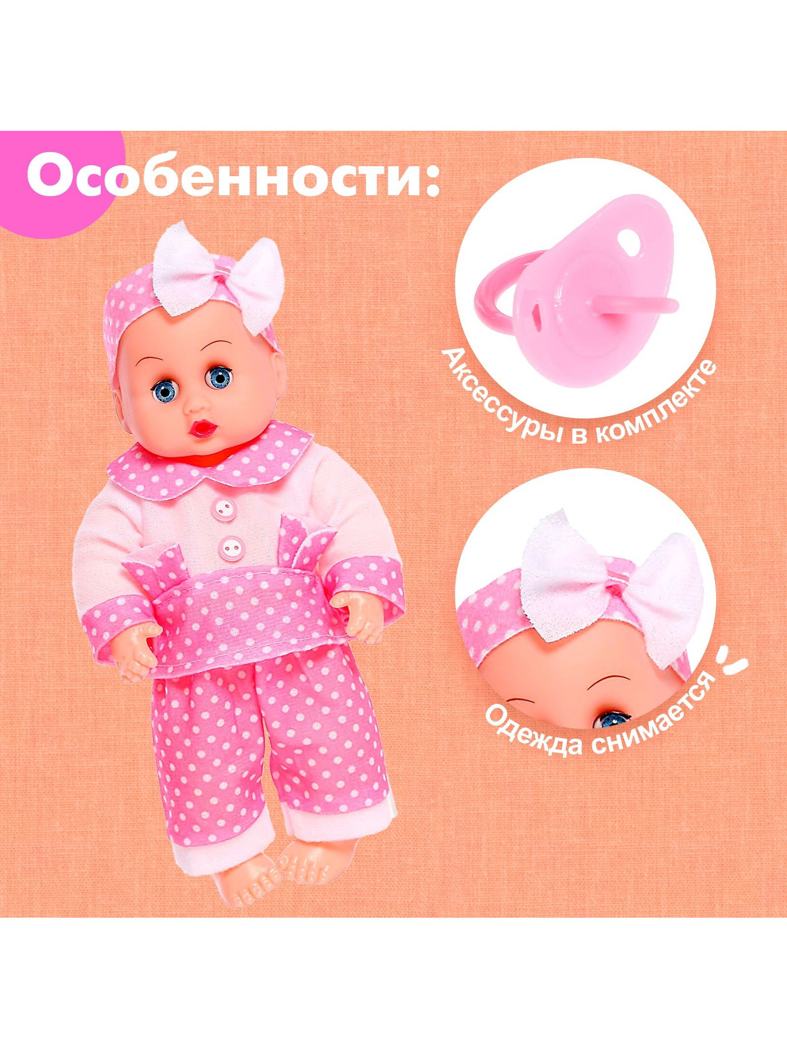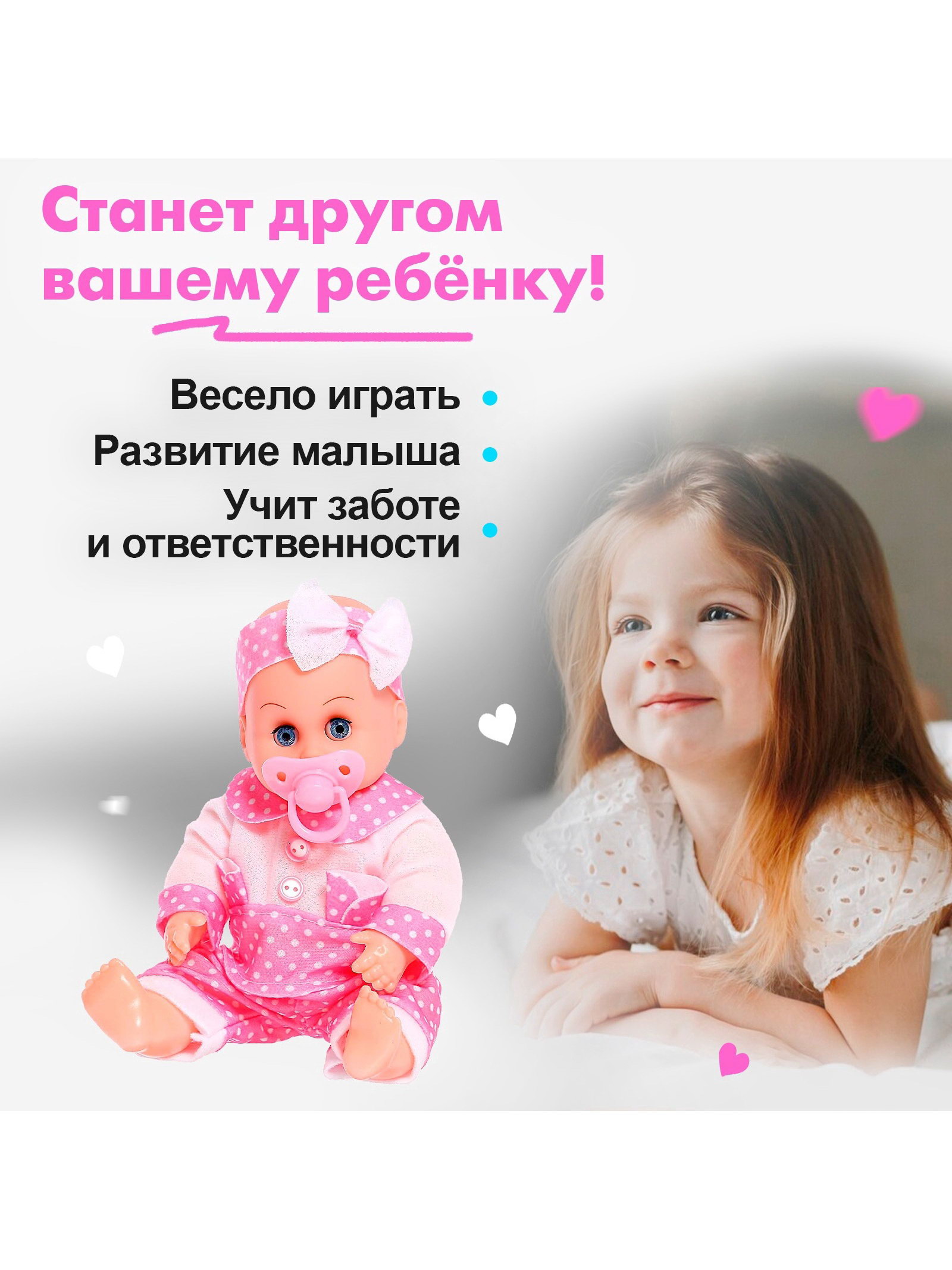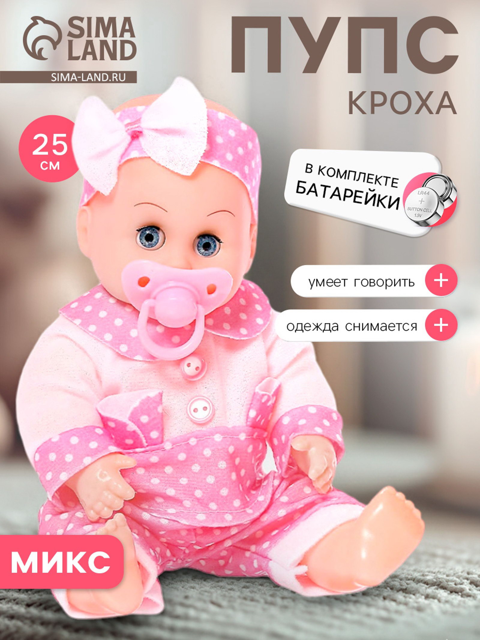 Дополнительные функции: Говорящая, Звуковые эффекты Особенности куклы: Закрывает глаза, Звуковые функции, Плачет Размер упаковки: 7 x 26 x 21 см. Для кого: Для девочки Высота, см: 25 tnved: 9503002000 Пол куклы: Девочка Одежда куклы: В платье Типоразмер батареек: LR44 (V13GA, AG13, LR1154, SR44) Звук: Да Количество батареек: 2 Вид упаковки: Пакет Возраст: От 3 лет Вид: Пупс Комплектация: С соской Батарейки в комплекте: Да Пупс одна из самых любимых детских игрушек. Благодаря ей малыши могут освоить социальные роли, научиться заботиться о ком-либо, проявить ответственность. Особенности пупса