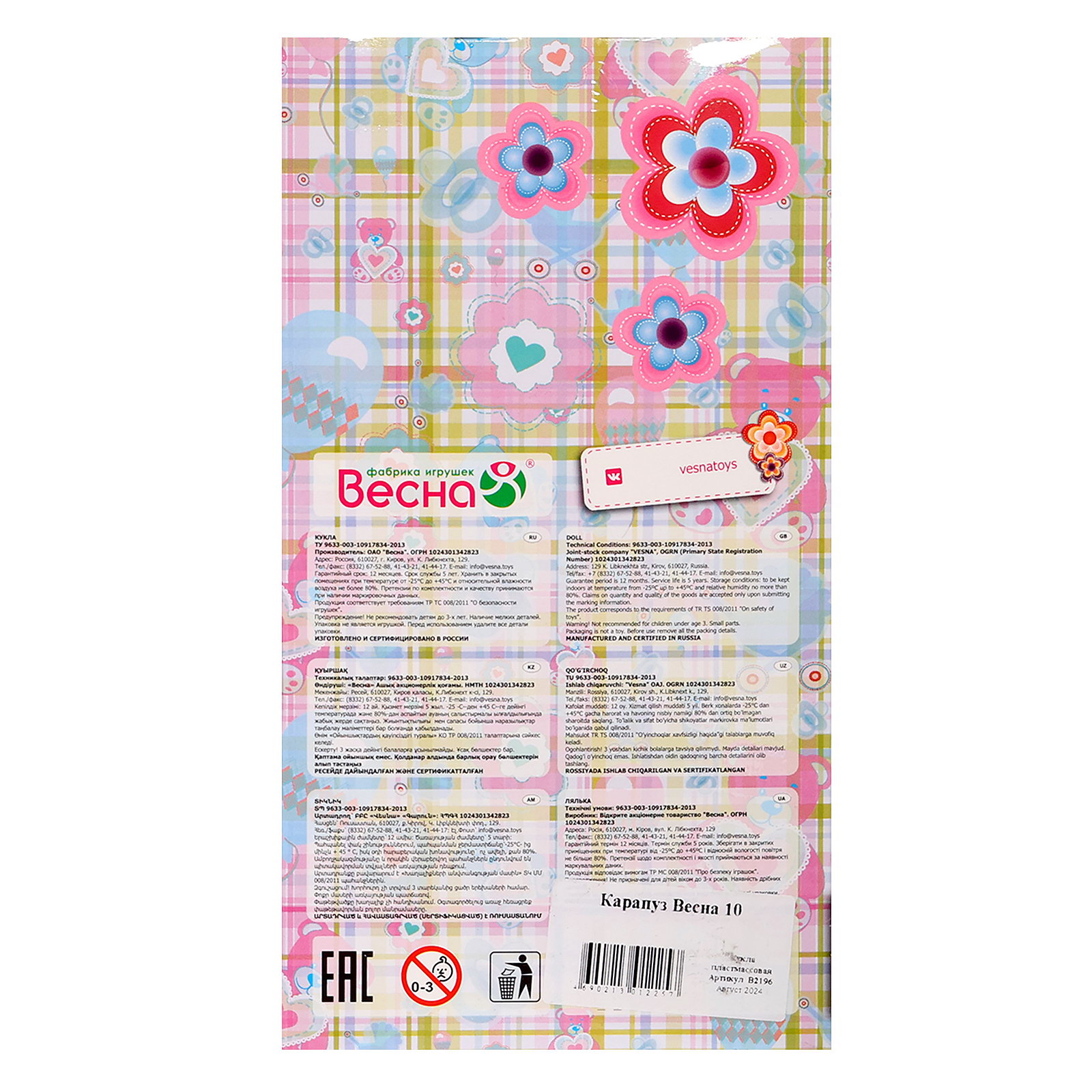 Размер упаковки: 13 x 24 x 8 см. Для кого: Для девочки Особенности куклы: Можно купать Возраст: От 3 лет Высота, см: 20 Вид упаковки: Коробка Вид упаковки: Коробка tnved: 9503002000 Тематика праздника: 8 Марта Вид: Пупс Кукла "Карапуз-мальчик 10" станет отличным выбором для вашего ребёнка. В комплекте с куклой есть комбинезон и шапочка, что позволит создать разные образы и превратить игру в увлекательное приключение. Возможности игры с этой куклой весьма разнообразны. Благодаря небольшим размерам и удобной конструкции куклу "Карапуз-мальчик 10" легко держать в руках, сажать, укладывать спать и переодевать. Куклу можно купать. Виниловое тело выполнено из эластичного и приятного на ощупь материала, что делает игру с куклой комфортной и приятной. Игра с куклой "Карапуз-мальчик 10" помогает развивать творческое воображение и мелкую моторику ребёнка. Дети смогут придумывать разные игровые сценарии и воплощать их в жизнь с помощью этой куклы. | ||